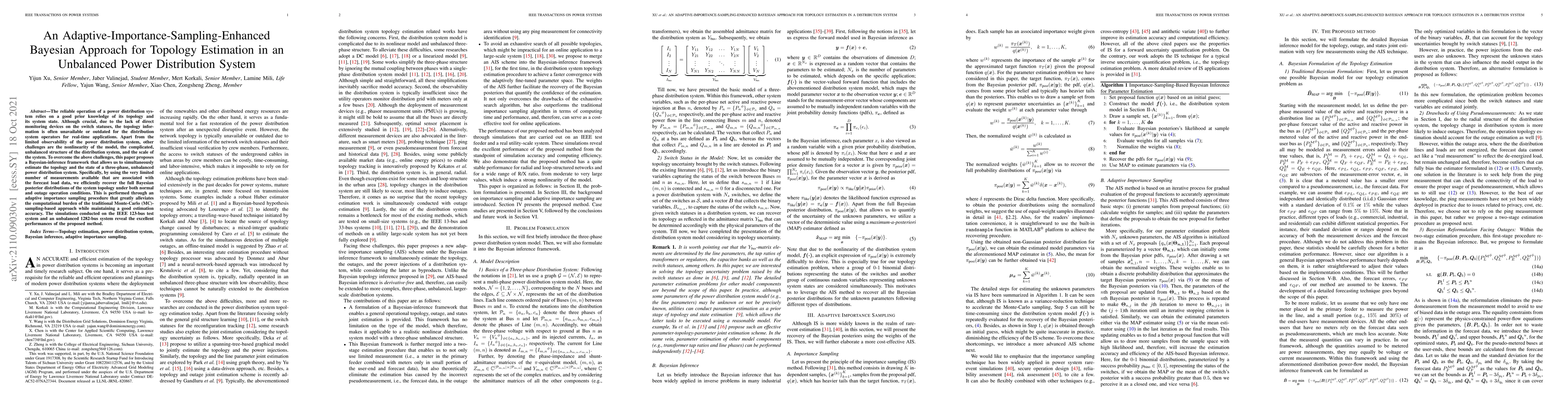 This paper proposes a Bayesian-inference framework with adaptive importance sampling to estimate the topology and state of a three-phase, unbalanced power distribution system, addressing challenges like nonlinearity and limited observability. The method efficiently recovers full Bayesian posterior distributions using limited measurements and forecast load data.