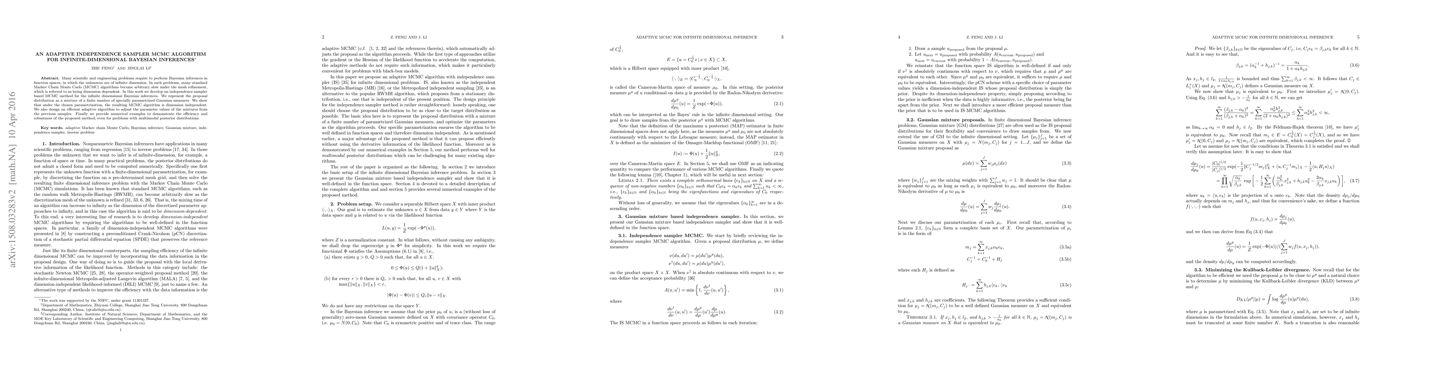 This paper proposes an adaptive independence sampler MCMC algorithm for infinite dimensional Bayesian inference, addressing the slow convergence of standard MCMC methods. The method uses a mixture of parametrized Gaussian measures to achieve dimension-independent performance and includes an adaptive scheme to optimize parameter values, demonstrated to be efficient and robust through numerical examples.
