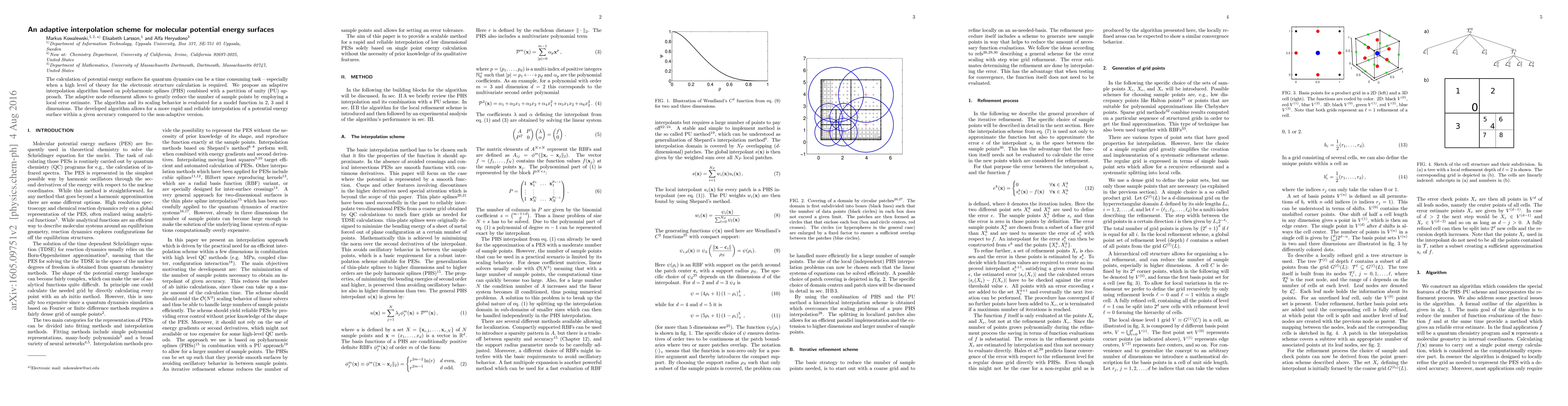 This paper proposes an adaptive interpolation scheme using polyharmonic splines and partition of unity to efficiently calculate potential energy surfaces for quantum dynamics. The adaptive node refinement significantly reduces the number of sample points through local error estimation, leading to faster and more reliable interpolation compared to non-adaptive methods.