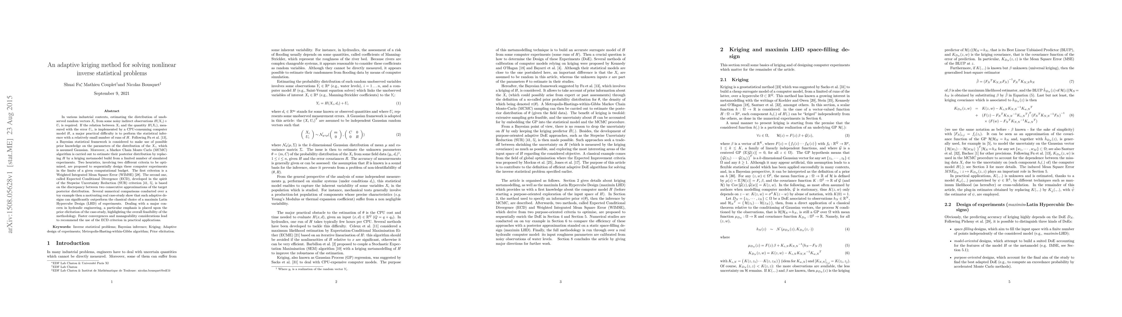 In various industrial contexts, estimating the distribution of unobserved random vectors Xi from some noisy indirect observations H(Xi) + Ui is required. If the relation between Xi and the quantity H(Xi), measured with the error Ui, is implemented by a CPU-consuming computer model H, a major practical difficulty is to perform the statistical inference with a relatively small number of runs of H. Following Fu et al. (2014), a Bayesian statistical framework is considered to make use of possible prior knowledge on the parameters of the distribution of the Xi, which is assumed Gaussian. Moreover, a Markov Chain Monte Carlo (MCMC) algorithm is carried out to estimate their posterior distribution by replacing H by a kriging metamodel build from a limited number of simulated experiments. Two heuristics, involving two different criteria to be optimized, are proposed to sequentially design these computer experiments in the limits of a given computational budget. The first criterion is a Weighted Integrated Mean Square Error (WIMSE). The second one, called Expected Conditional Divergence (ECD), developed in the spirit of the Stepwise Uncertainty Reduction (SUR) criterion, is based on the discrepancy between two consecutive approximations of the target posterior distribution. Several numerical comparisons conducted over a toy example then a motivating real case-study show that such adaptive designs can significantly outperform the classical choice of a maximin Latin Hypercube Design (LHD) of experiments. Dealing with a major concern in hydraulic engineering, a particular emphasis is placed upon the prior elicitation of the case-study, highlighting the overall feasibility of the methodology. Faster convergences and manageability considerations lead to recommend the use of the ECD criterion in practical applications.