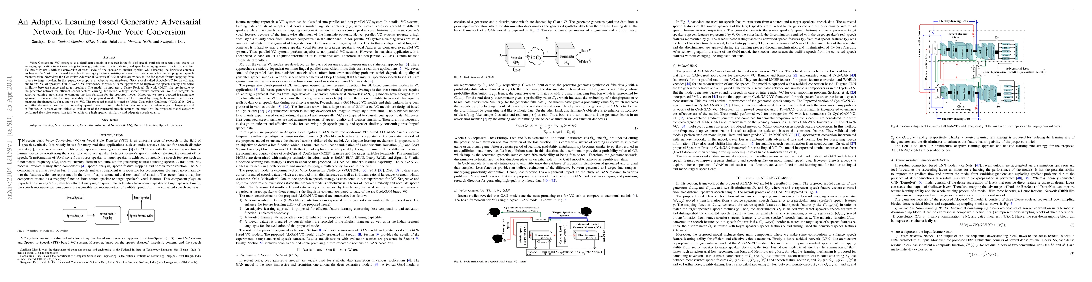 This paper proposes an adaptive learning-based GAN model, ALGAN-VC, for efficient one-to-one voice conversion, incorporating a Dense Residual Network for feature mapping and adaptive learning mechanisms to enhance speech quality and voice similarity. The model was tested on multiple datasets, showing high speaker similarity and adequate speech quality.
