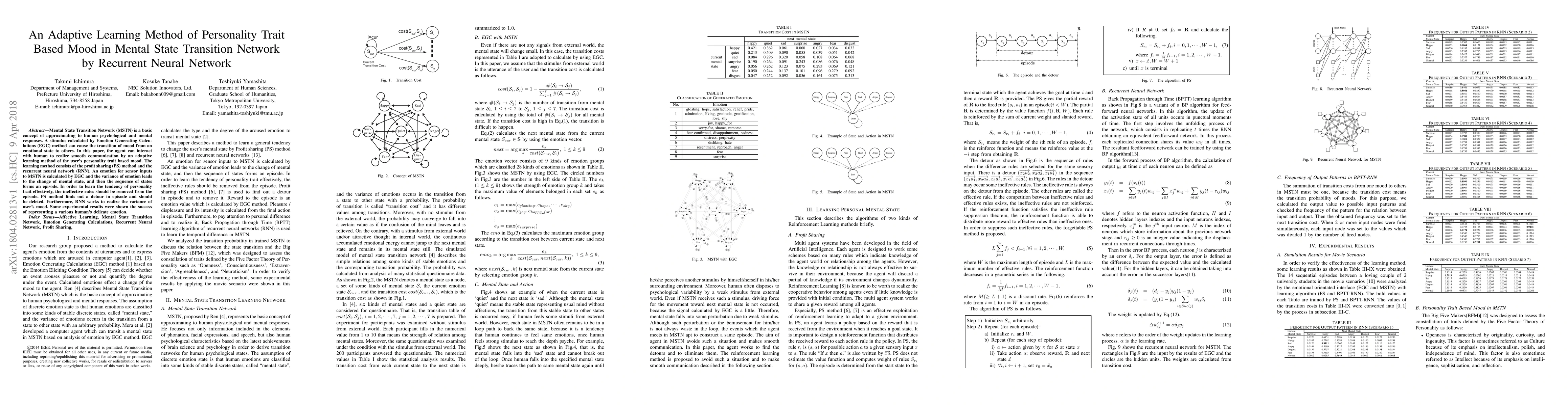 Mental State Transition Network (MSTN) is a basic concept of approximating to human psychological and mental responses. A stimulus calculated by Emotion Generating Calculations (EGC) method can cause the transition of mood from an emotional state to others. In this paper, the agent can interact with human to realize smooth communication by an adaptive learning method of the user's personality trait based mood. The learning method consists of the profit sharing (PS) method and the recurrent neural network (RNN). An emotion for sensor inputs to MSTN is calculated by EGC and the variance of emotion leads to the change of mental state, and then the sequence of states forms an episode. In order to learn the tendency of personality trait effectively, the ineffective rules should be removed from the episode. PS method finds out a detour in episode and should be deleted. Furthermore, RNN works to realize the variance of user's mood. Some experimental results were shown the success of representing a various human's delicate emotion.