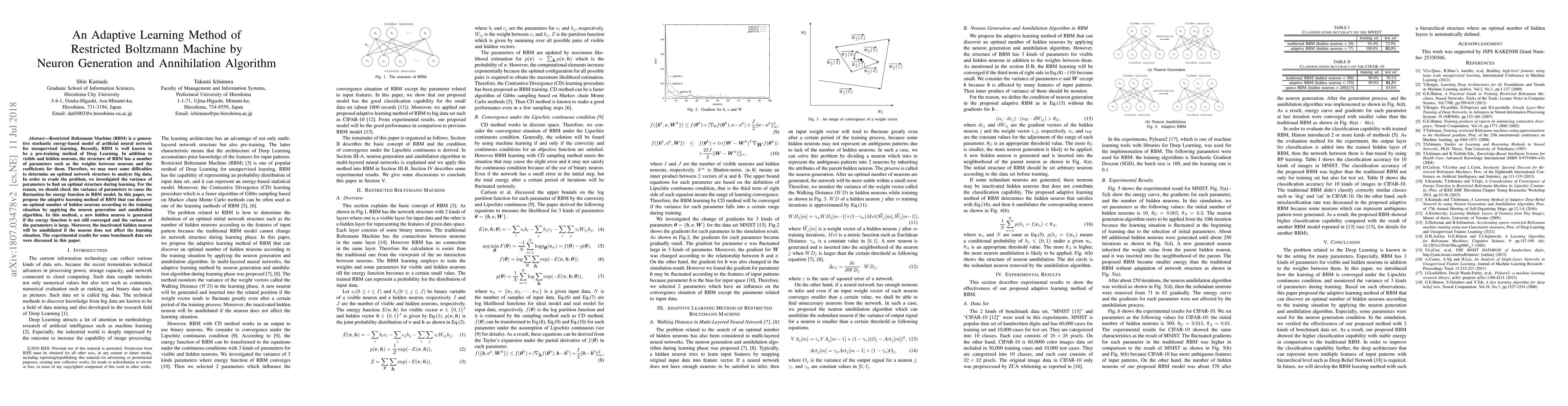 This paper proposes an adaptive learning method for Restricted Boltzmann Machines (RBM) using a neuron generation and annihilation algorithm to optimize the network structure dynamically during training. The method generates new hidden neurons when the energy function is not converged and parameter variance is high, and annihilates inactive neurons to improve efficiency.