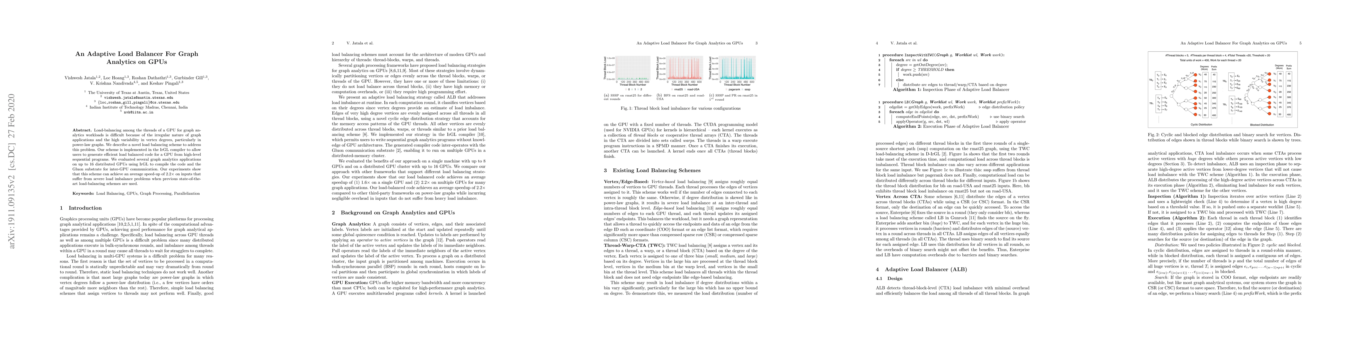 This paper proposes an adaptive load balancing scheme for GPU-based graph analytical applications to tackle the challenges posed by irregular workloads and high vertex degree variability. The scheme is integrated into the IrGL compiler, enabling efficient GPU code generation from high-level programs, and demonstrates a 2.2x average speed-up on distributed GPUs for applications with severe load imbalance.