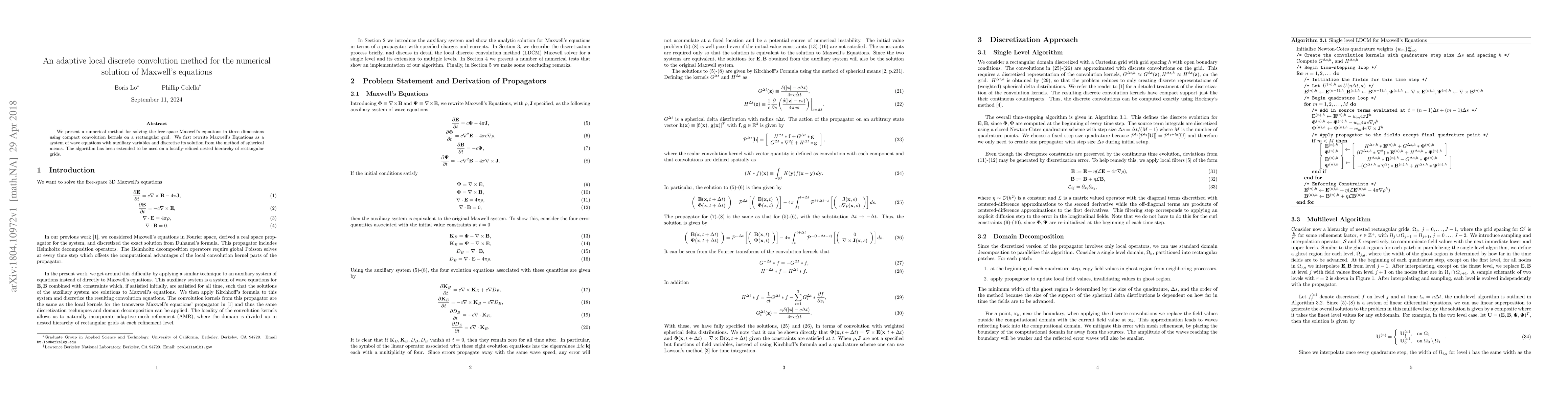 We present a numerical method for solving the free-space Maxwell's equations in three dimensions using compact convolution kernels on a rectangular grid. We first rewrite Maxwell's Equations as a system of wave equations with auxiliary variables and discretize its solution from the method of spherical means. The algorithm has been extended to be used on a locally-refined nested hierarchy of rectangular grids.