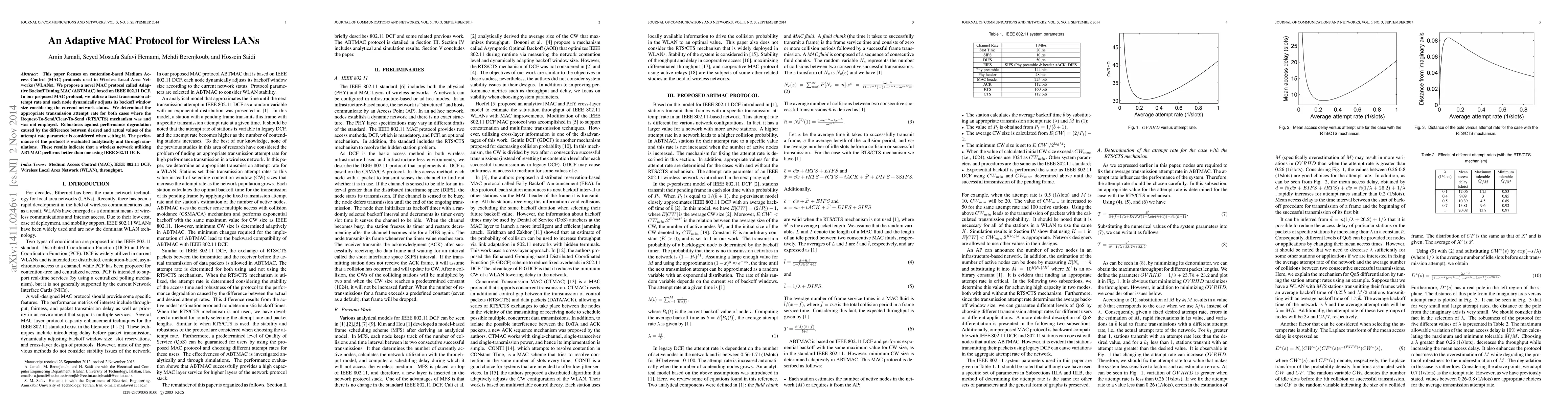 This paper focuses on contention-based Medium Access Control (MAC) protocols used in Wireless Local Area Networks (WLANs). We propose a novel MAC protocol called Adaptive Backoff Tuning MAC (ABTMAC) based on IEEE 802.11 DCF. In our proposed MAC protocol, we utilize a fixed transmission attempt rate and each node dynamically adjusts its backoff window size considering the current network status. We determined the appropriate transmission attempt rate for both cases where the Request-To-Send/Clear-To-Send (RTS/CTS) mechanism was and was not employed. Robustness against performance degradation caused by the difference between desired and actual values of the attempt rate parameter is considered when setting it. The performance of the protocol is evaluated analytically and through simulations. These results indicate that a wireless network utilizing ABTMAC performs better than one using IEEE 802.11 DCF.