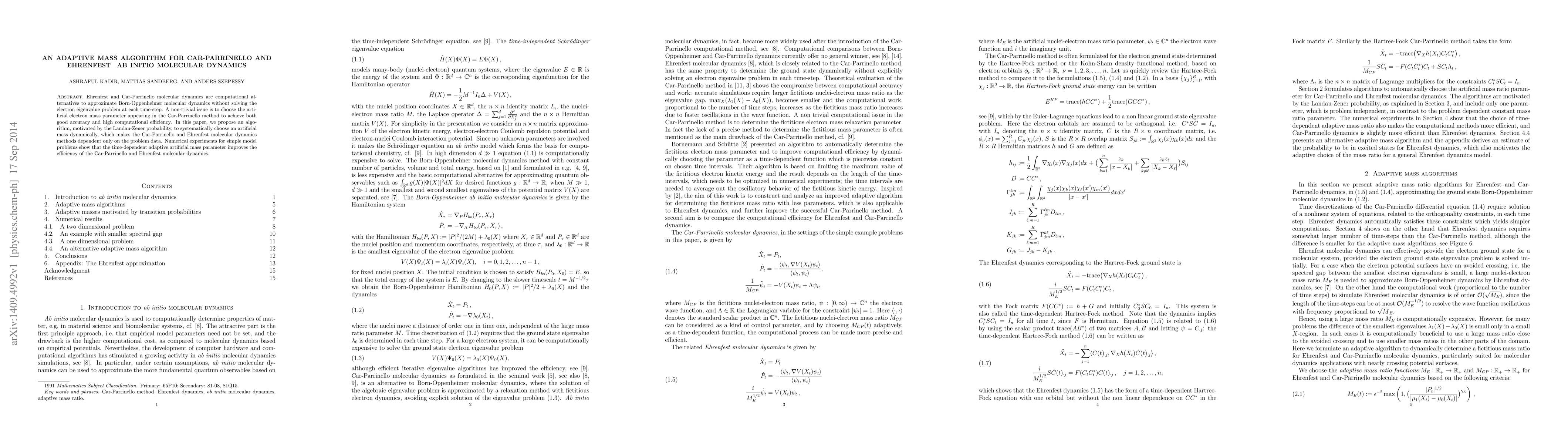 This paper proposes an adaptive mass algorithm for Car-Parrinello and Ehrenfest ab initio molecular dynamics, dynamically selecting an artificial mass parameter based on Landau-Zener probability to enhance accuracy and efficiency. Numerical experiments demonstrate improved performance for simple model problems.