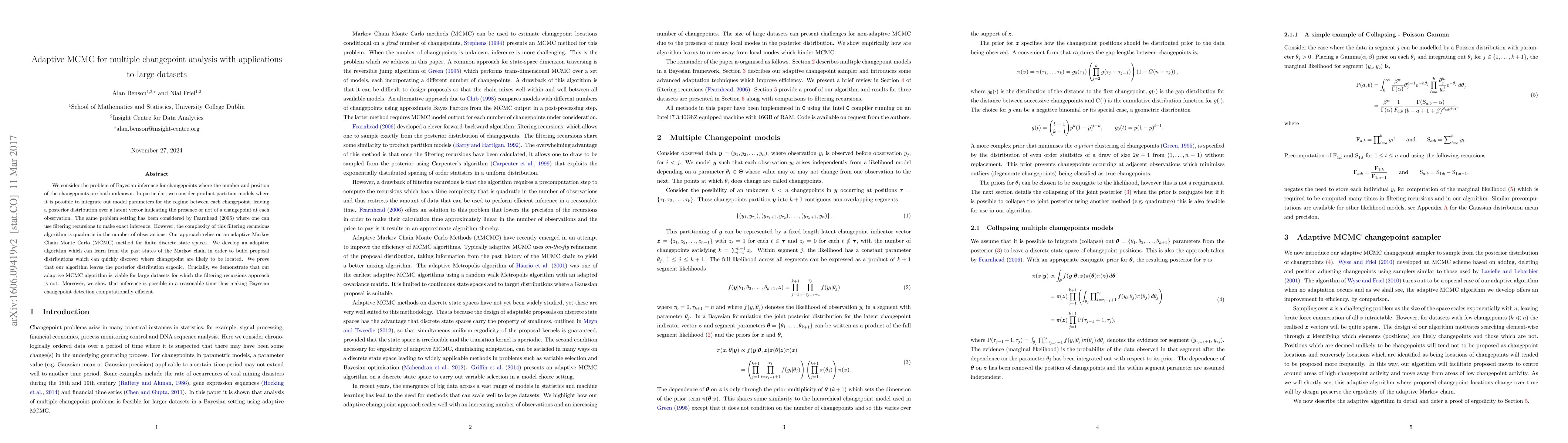 This paper proposes an adaptive MCMC method for Bayesian inference in changepoint detection problems, particularly suited for large datasets. Unlike traditional filtering recursions, the adaptive MCMC approach efficiently discovers likely changepoint locations and maintains computational feasibility for extensive data.