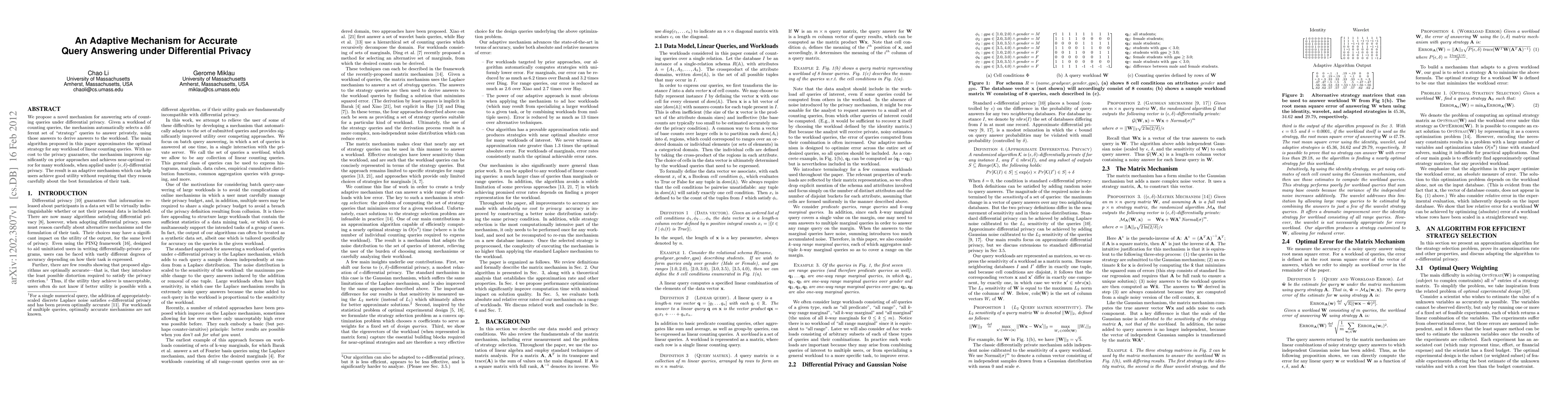 This paper introduces an adaptive mechanism for answering counting queries under differential privacy, which dynamically selects optimal "strategy" queries to maximize utility while maintaining privacy. The proposed algorithm achieves near-optimal error for many query workloads, significantly improving on prior approaches without compromising privacy guarantees.