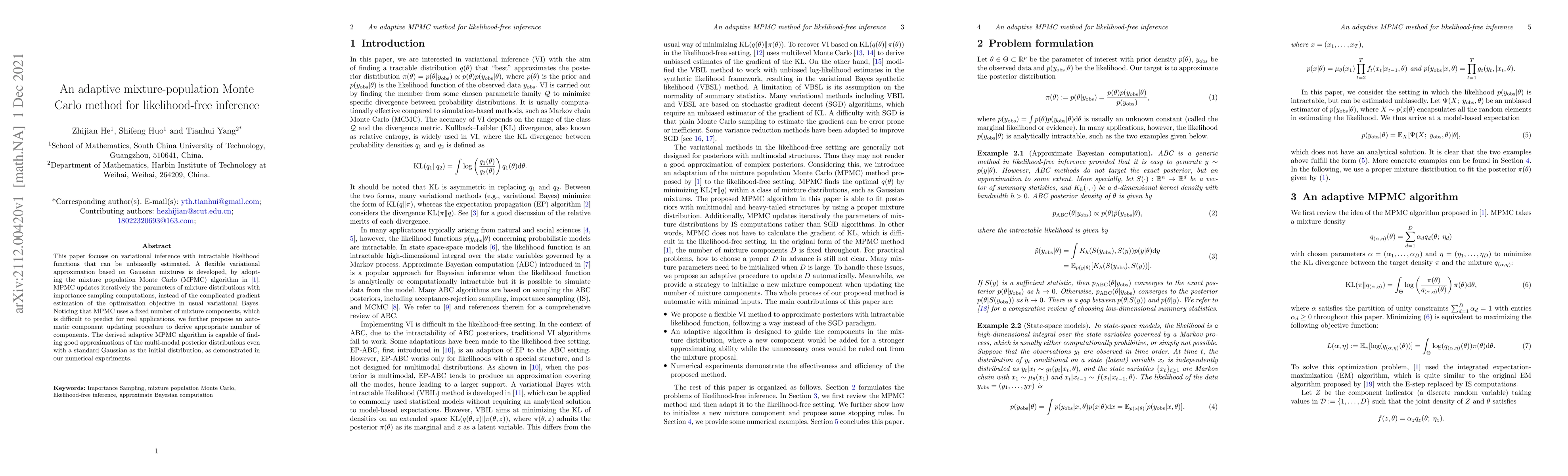 A new method for variational inference with intractable likelihood functions uses an adaptive mixture-population Monte Carlo algorithm to find good approximations of multi-modal posterior distributions. The method automatically updates the number of components in the mixture distribution to improve accuracy.