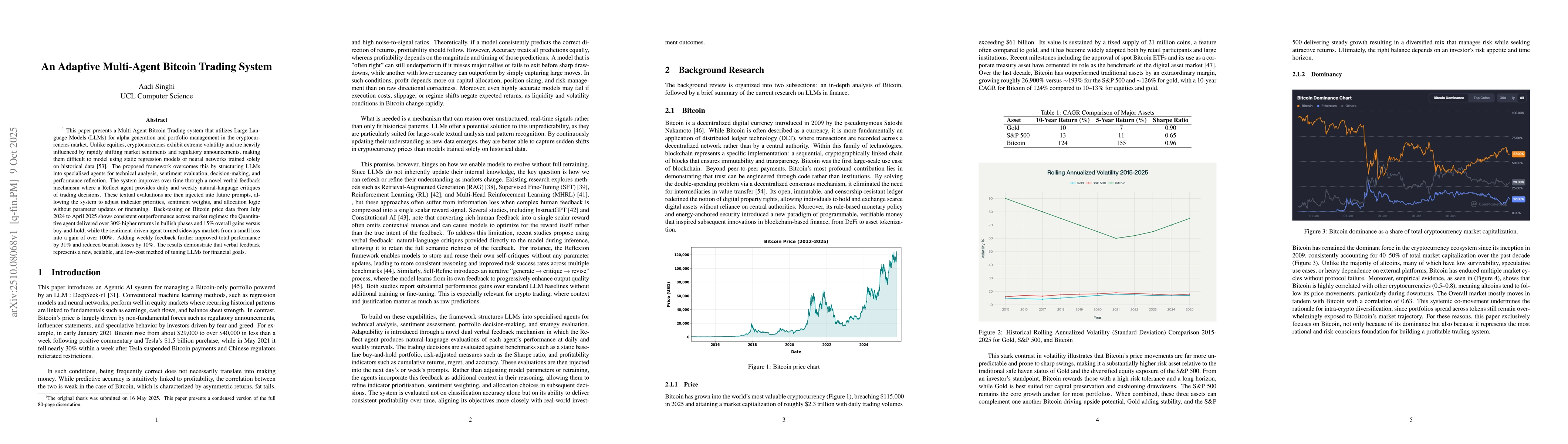 This paper presents a Multi Agent Bitcoin Trading system that utilizes Large Language Models (LLMs) for alpha generation and portfolio management in the cryptocurrencies market. Unlike equities, cryptocurrencies exhibit extreme volatility and are heavily influenced by rapidly shifting market sentiments and regulatory announcements, making them difficult to model using static regression models or neural networks trained solely on historical data [53]. The proposed framework overcomes this by structuring LLMs into specialised agents for technical analysis, sentiment evaluation, decision-making, and performance reflection. The system improves over time through a novel verbal feedback mechanism where a Reflect agent provides daily and weekly natural-language critiques of trading decisions. These textual evaluations are then injected into future prompts, allowing the system to adjust indicator priorities, sentiment weights, and allocation logic without parameter updates or finetuning. Back-testing on Bitcoin price data from July 2024 to April 2025 shows consistent outperformance across market regimes: the Quantitative agent delivered over 30% higher returns in bullish phases and 15% overall gains versus buy-and-hold, while the sentiment-driven agent turned sideways markets from a small loss into a gain of over 100%. Adding weekly feedback further improved total performance by 31% and reduced bearish losses by 10%. The results demonstrate that verbal feedback represents a new, scalable, and low-cost method of tuning LLMs for financial goals.