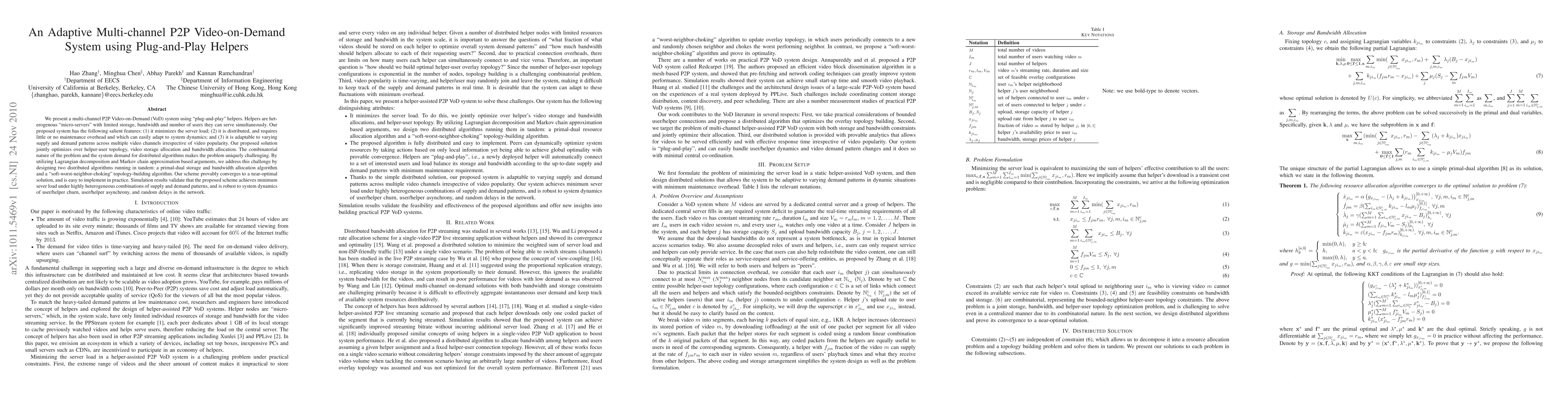 This paper proposes an adaptive multi-channel P2P VoD system utilizing "plug-and-play" helpers to minimize server load, optimize storage and bandwidth allocation, and adapt to varying supply and demand patterns. The system employs distributed algorithms to achieve near-optimal solutions, validated by simulations showing robustness to user/helper dynamics.