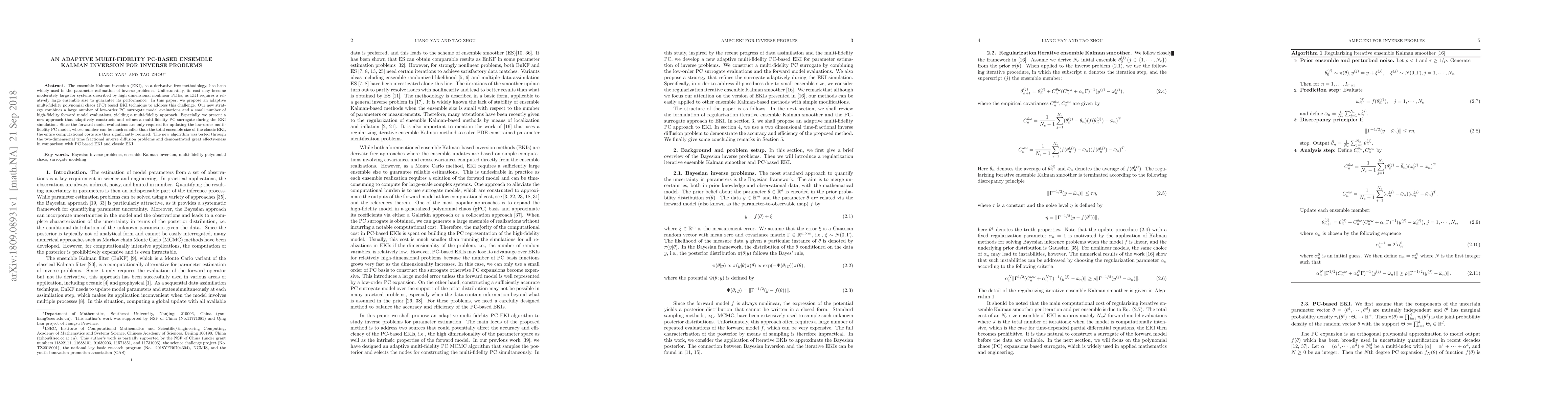 This paper proposes an adaptive multi-fidelity ensemble Kalman inversion (EKI) technique using polynomial chaos (PC) to reduce computational costs for high-dimensional nonlinear PDEs. The new method efficiently combines low-order PC surrogate models and a few high-fidelity forward model evaluations, significantly reducing overall computational costs while maintaining performance.