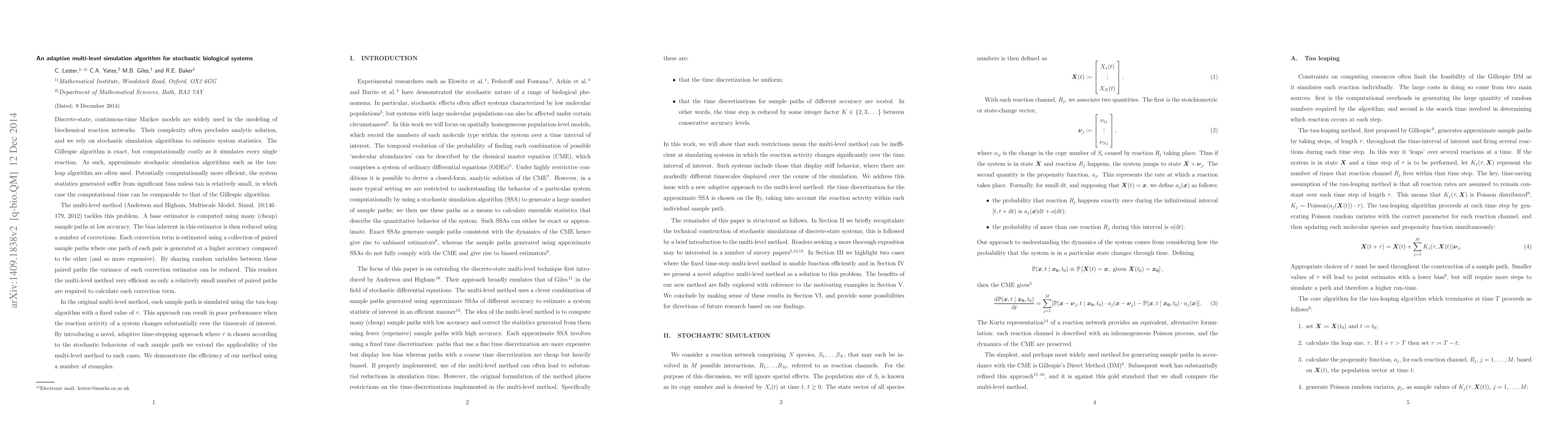 A new adaptive multi-level simulation algorithm for stochastic biological systems is proposed to efficiently estimate system statistics with reduced bias, applicable to changing reaction activity over time.