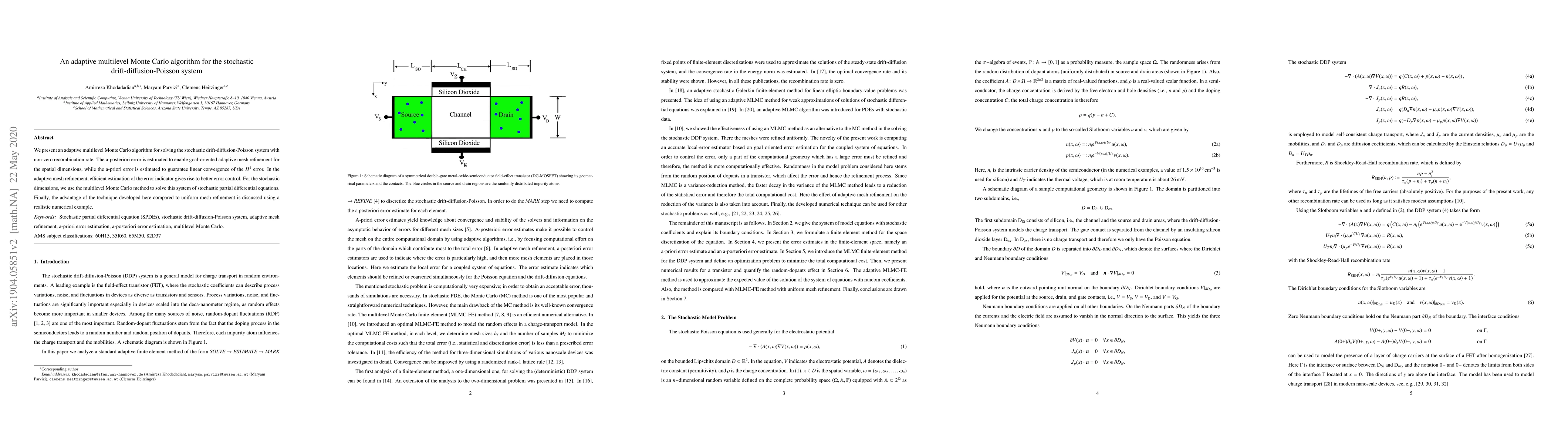 This paper introduces an adaptive multilevel Monte Carlo algorithm for solving the stochastic drift-diffusion-Poisson system, incorporating adaptive mesh refinement for spatial dimensions and multilevel Monte Carlo for stochastic dimensions. The method ensures linear convergence and better error control compared to uniform mesh refinement, as demonstrated through a realistic numerical example.