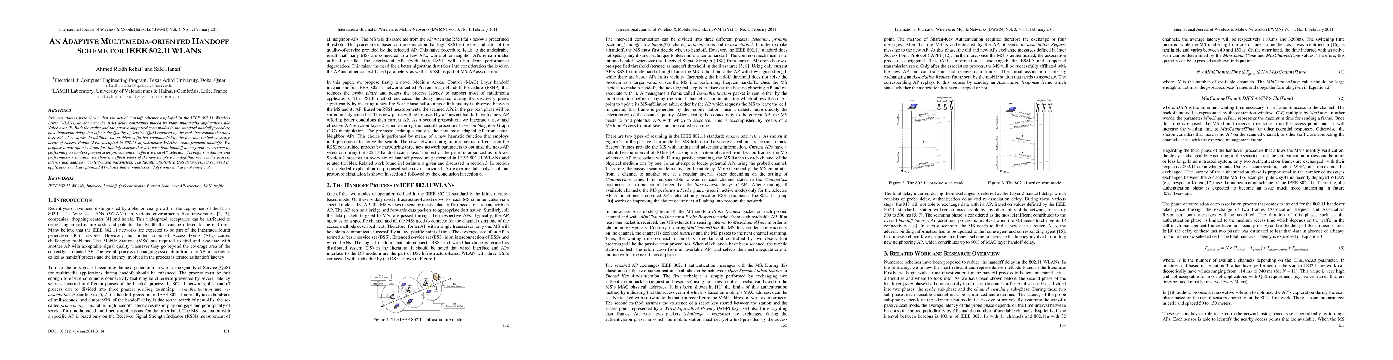 This paper proposes an adaptive multimedia-oriented handoff scheme for IEEE 802.11 WLANs to reduce latency and improve QoS for real-time applications like Voice over IP by optimizing the handoff process and next Access Point selection. The new scheme effectively decreases handoff latency and occurrence through a seamless prevent scan and context-based parameters.