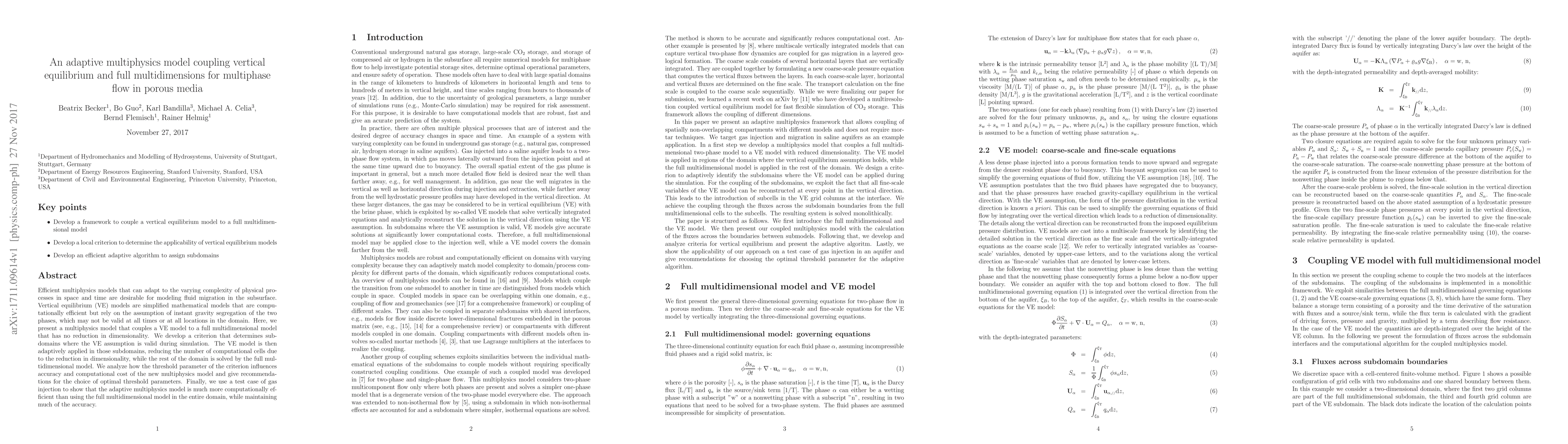 This research introduces an adaptive multiphysics model that combines Vertical Equilibrium (VE) and full multidimensional models for simulating fluid movement in porous media. The model intelligently switches between these approaches based on a criterion, enhancing computational efficiency while maintaining accuracy.