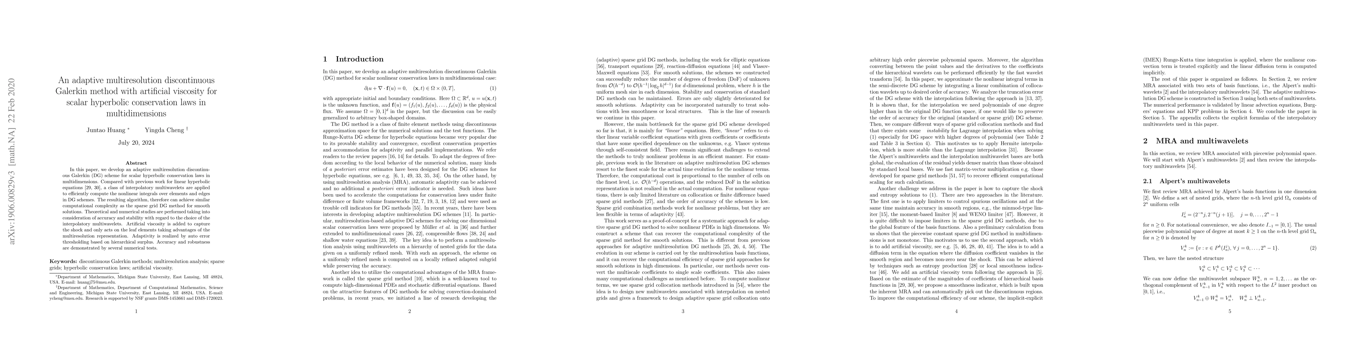 This paper introduces an adaptive multiresolution discontinuous Galerkin method with artificial viscosity for solving multi-dimensional scalar hyperbolic conservation laws. It employs interpolatory multiwavelets to efficiently handle nonlinear integrals, enhancing computational efficiency comparable to sparse grid methods.