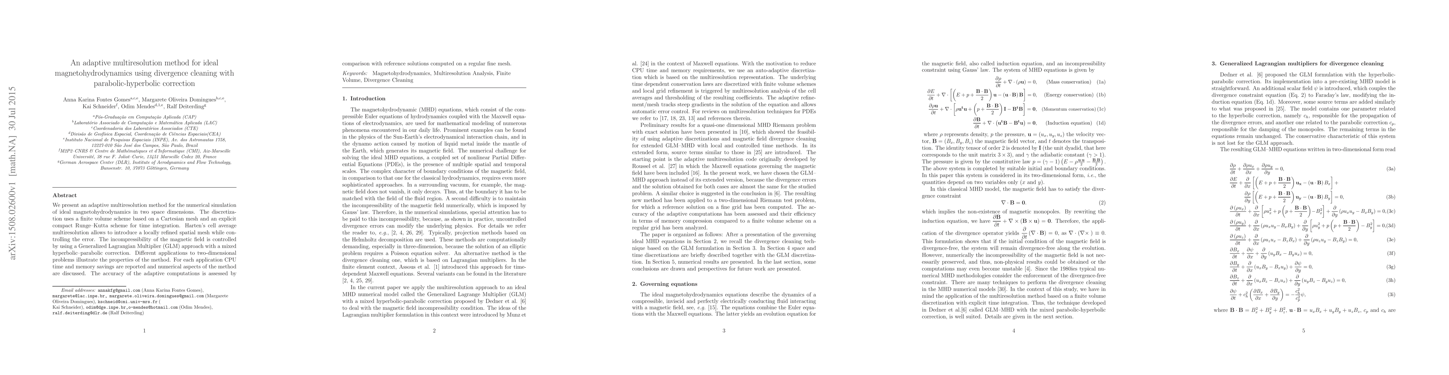 This paper introduces an adaptive multiresolution method for simulating ideal magnetohydrodynamics, employing a finite volume scheme and a GLM approach with parabolic-hyperbolic correction for divergence cleaning. The method demonstrates CPU time and memory savings, and its accuracy is validated against reference solutions.