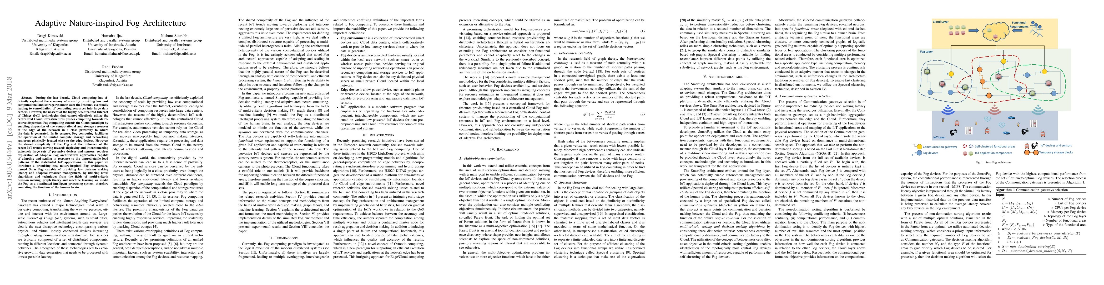 During the last decade, Cloud computing has efficiently exploited the economy of scale by providing low cost computational and storage resources over the Internet, eventually leading to consolidation of computing resources into large data centers. However, the nascent of the highly decentralized Internet of Things (IoT) technologies that cannot effectively utilize the centralized Cloud infrastructures pushes computing towards resource dispersion. Fog computing extends the Cloud paradigm by enabling dispersion of the computational and storage resources at the edge of the network in a close proximity to where the data is generated. In its essence, Fog computing facilitates the operation of the limited compute, storage and networking resources physically located close to the edge devices. However, the shared complexity of the Fog and the influence of the recent IoT trends moving towards deploying and interconnecting extremely large sets of pervasive devices and sensors, requires exploration of adaptive Fog architectural approaches capable of adapting and scaling in response to the unpredictable load patterns of the distributed IoT applications. In this paper we introduce a promising new nature-inspired Fog architecture, named SmartFog, capable of providing low decision making latency and adaptive resource management. By utilizing novel algorithms and techniques from the fields of multi-criteria decision making, graph theory and machine learning we model the Fog as a distributed intelligent processing system, therefore emulating the function of the human brain.