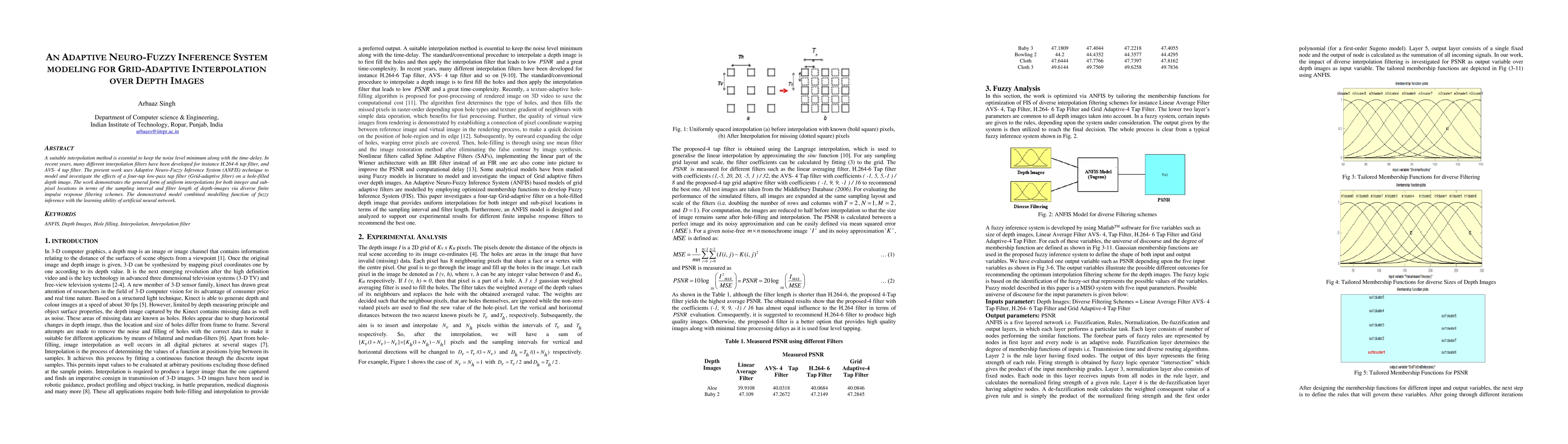 A suitable interpolation method is essential to keep the noise level minimum along with the time-delay. In recent years, many different interpolation filters have been developed for instance H.264-6 tap filter, and AVS- 4 tap filter. The present work uses Adaptive Neuro-Fuzzy Inference System (ANFIS) technique to model and investigate the effects of a four-tap low-pass tap filter (Grid-adaptive filter) on a hole-filled depth image. The work demonstrates the general form of uniform interpolations for both integer and sub-pixel locations in terms of the sampling interval and filter length of depth-images via diverse finite impulse response filtering schemes. The demonstrated model combined modelling function of fuzzy inference with the learning ability of artificial neural network.