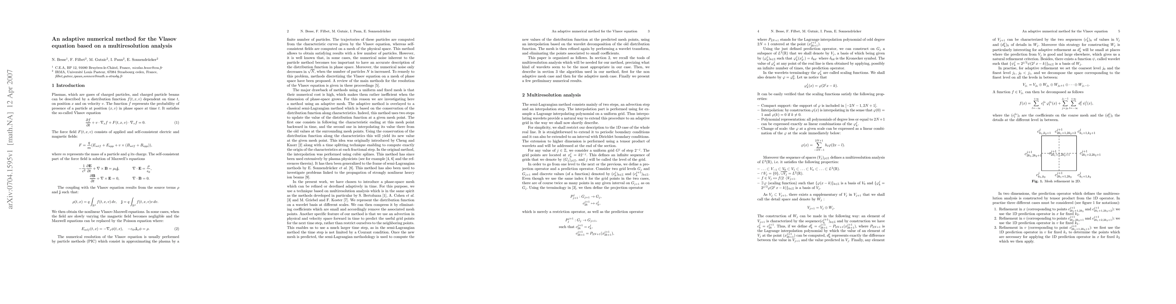 Summary: This paper introduces an adaptive numerical method for solving the Vlasov equation using a semi-Lagrangian approach and multiresolution analysis for grid adaptivity, focusing on applications in particle accelerators and plasma physics. Initial results demonstrate the method's effectiveness.