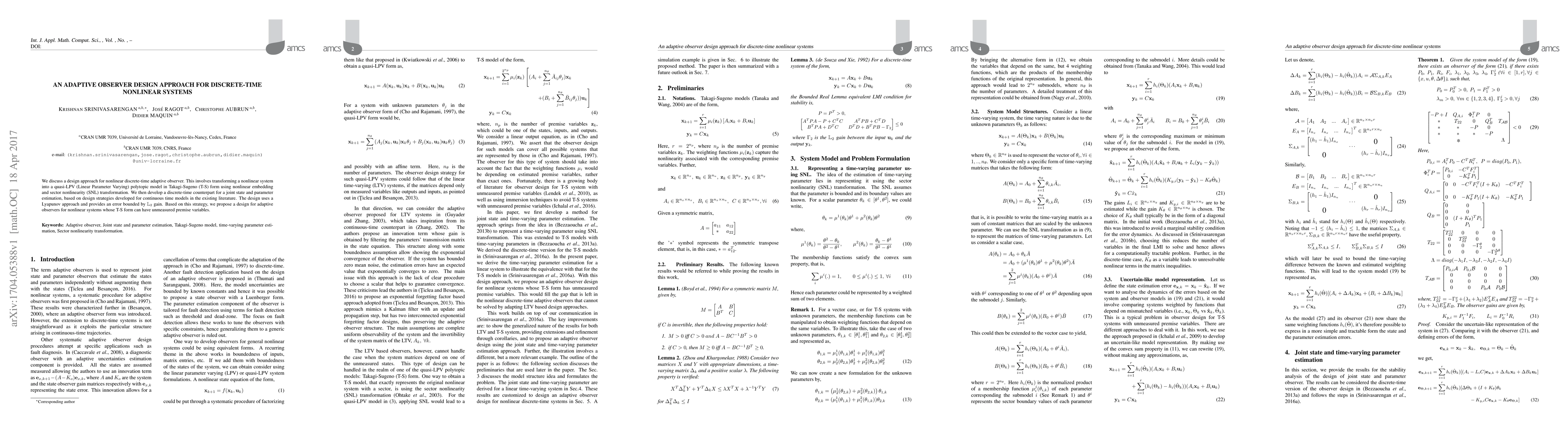 We discuss a design approach for nonlinear discrete-time adaptive observer. This involves transforming a nonlinear system into a quasi-LPV (Linear Parameter Varying) polytopic model in Takagi-Sugeno (T-S) form using nonlinear embedding and sector nonlinearity (SNL) transformation. We then develop a discrete-time counterpart for a joint state and parameter estimation, based on design strategies developed for continuous time models in the existing literature. The design uses a Lyapunov approach and provides an error bounded by $\mathbb{L}_2$ gain. Based on this strategy, we propose a design for adaptive observers for nonlinear systems whose T-S form can have unmeasured premise variables.