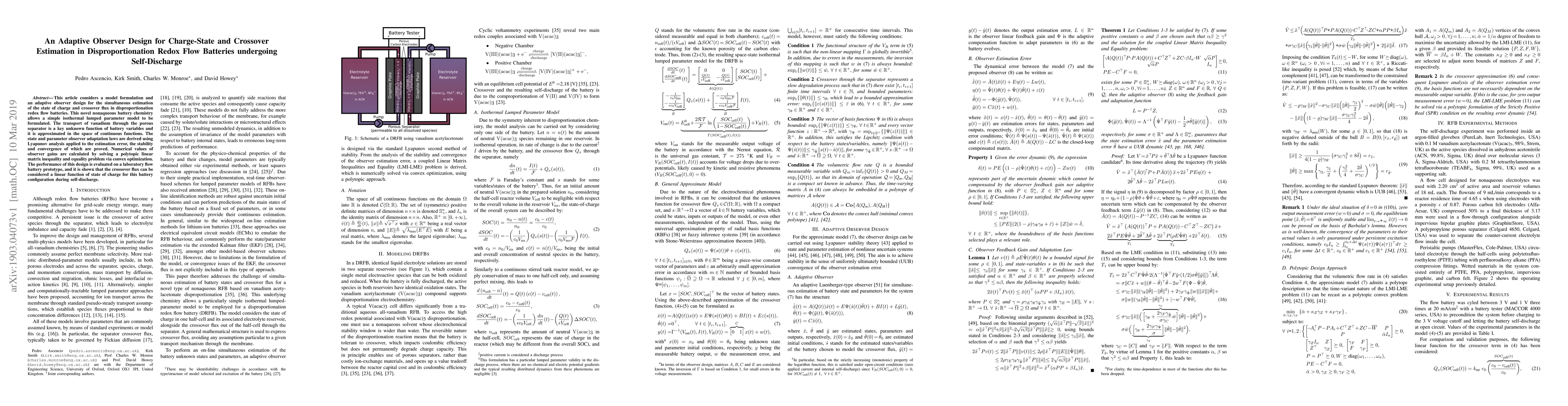 This article considers a model formulation and an adaptive observer design for the simultaneous estimation of the state of charge and crossover flux in disproportionation redox flow batteries. This novel nonaqueous battery chemistry allows a simple isothermal lumped parameter model to be formulated. The transport of vanadium through the porous separator is a key unknown function of battery variables and it is approximated in the space of continuous functions. The state and parameter observer adaptation laws are derived using Lyapunov analysis applied to the estimation error, the stability and convergence of which are proved. Numerical values of observer gains are calculated by solving a polytopic linear matrix inequality and equality problem via convex optimization. The performance of this design is evaluated on a laboratory flow battery prototype, and it is shown that the crossover flux can be considered a linear function of state of charge for this battery configuration during self-discharge.