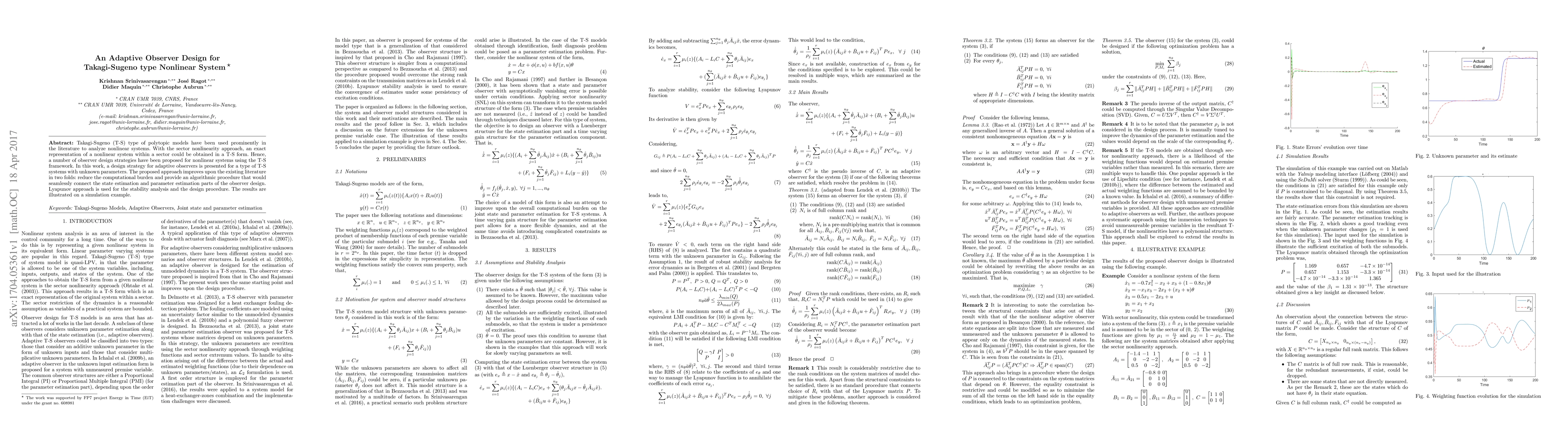 This paper proposes an adaptive observer design for Takagi-Sugeno (T-S) type nonlinear systems with unknown parameters, aiming to reduce computational burden and integrate state and parameter estimation seamlessly. Stability is analyzed using the Lyapunov approach.