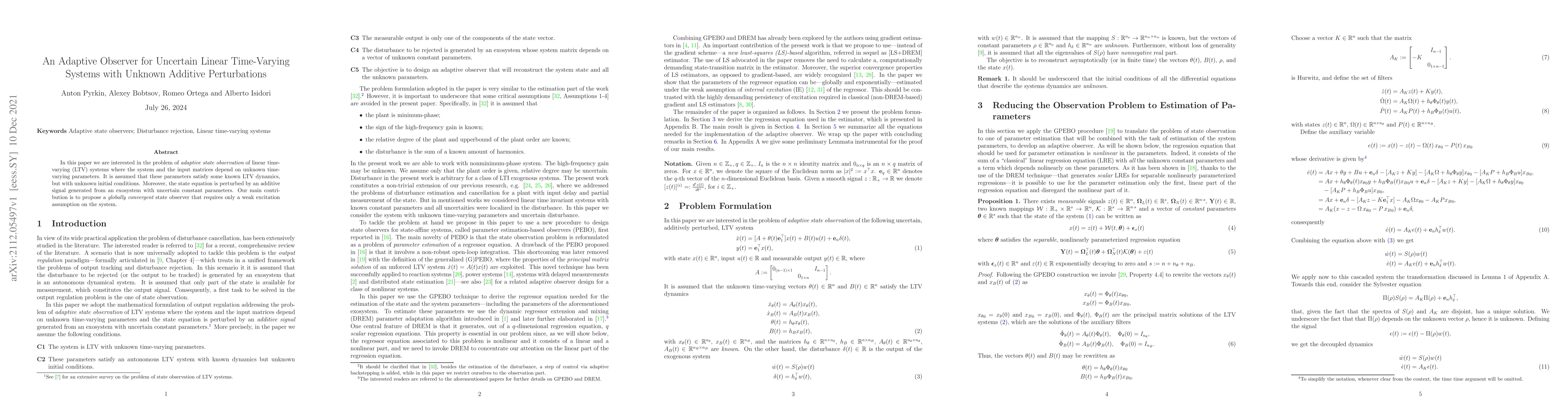 This paper proposes an adaptive observer for uncertain linear time-varying systems with unknown additive perturbations, ensuring global convergence and requiring only a weak excitation assumption on the system. The observer addresses unknown time-varying parameters and uncertain initial conditions.