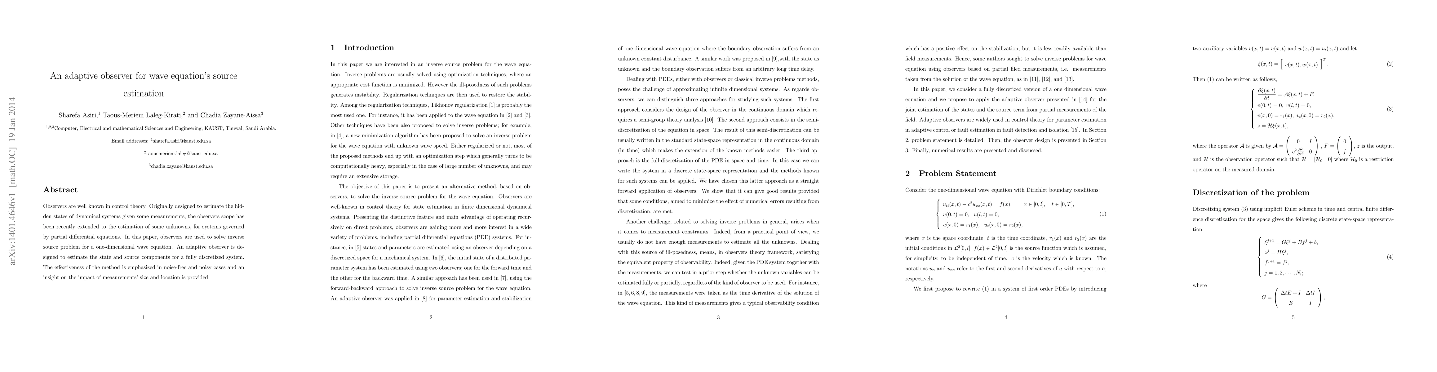 Observers are well known in control theory. Originally designed to estimate the hidden states of dynamical systems given some measurements, the observers scope has been recently extended to the estimation of some unknowns, for systems governed by partial differential equations. In this paper, observers are used to solve inverse source problem for a one-dimensional wave equation. An adaptive observer is designed to estimate the state and source components for a fully discretized system. The effectiveness of the method is emphasized in noise-free and noisy cases and an insight on the impact of measurements' size and location is provided.