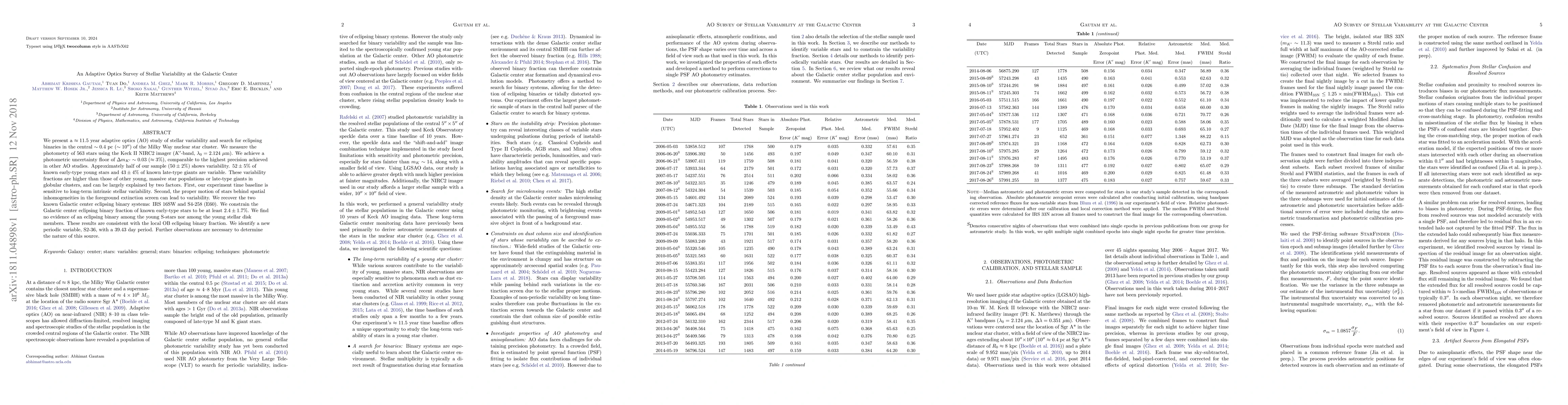 This study uses adaptive optics to survey stellar variability in the Milky Way's central region over 11.5 years, finding that half of the observed stars exhibit variability, with early-type stars showing higher variability. The research identifies a new periodic variable and confirms the presence of two known eclipsing binaries, estimating the eclipsing binary fraction among early-type stars at the Galactic center.