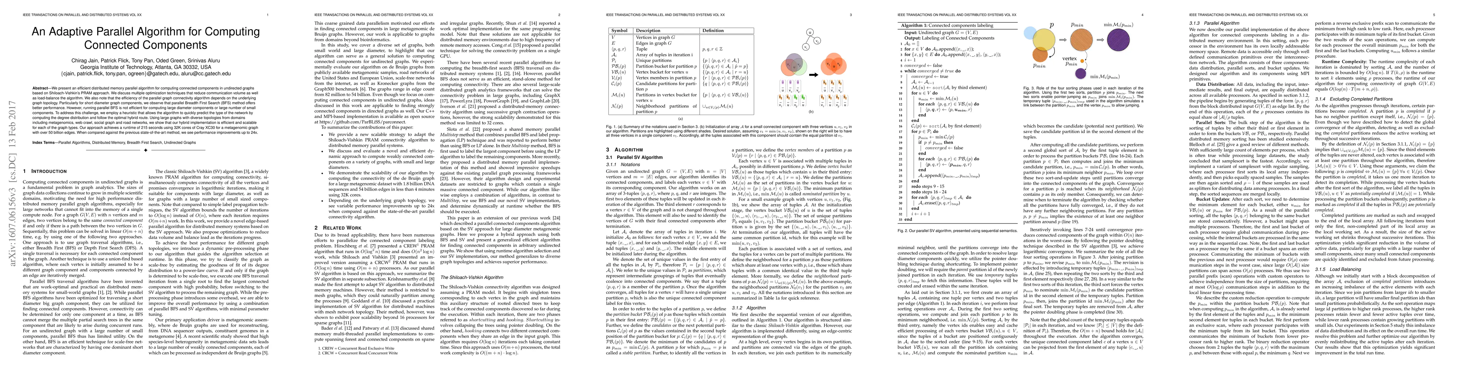 This paper presents an adaptive parallel algorithm for computing connected components in undirected graphs, optimizing communication and load-balance. It employs a hybrid approach combining parallel BFS and heuristics to efficiently handle diverse graph topologies, achieving up to 24x performance improvements over previous methods.