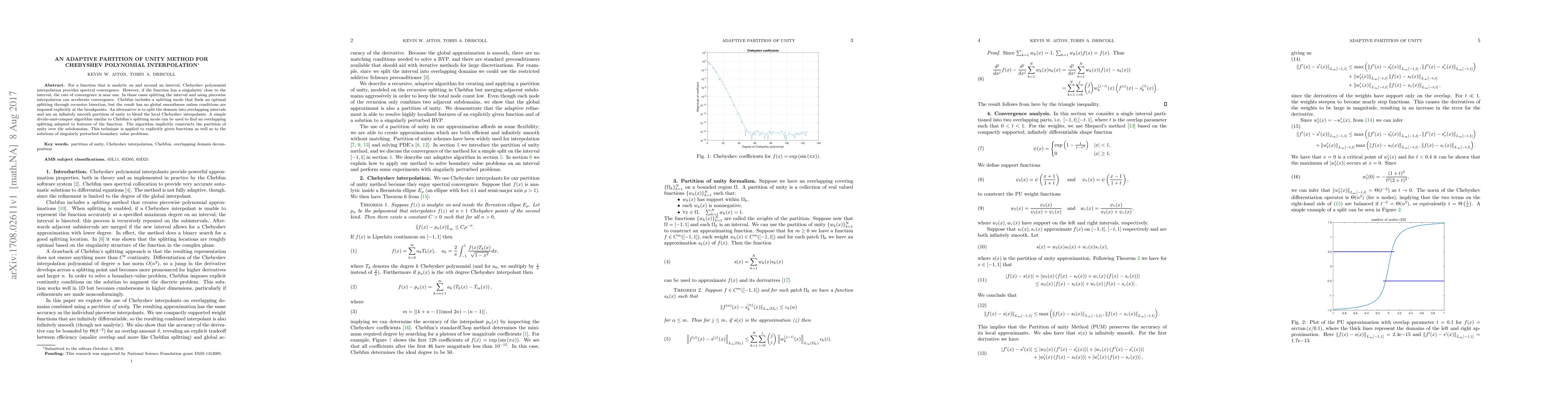 This paper proposes an adaptive partition of unity method for Chebyshev polynomial interpolation that enhances convergence near singularities by splitting the domain into overlapping intervals and using a smooth blending technique. The method is shown to improve convergence rates and maintain global smoothness, applied to both explicit functions and solutions of singularly perturbed problems.