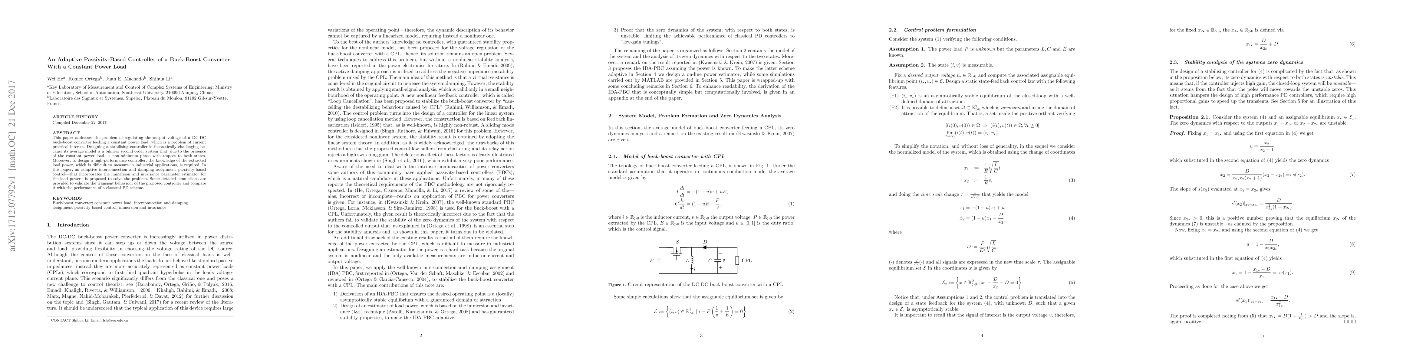 This paper addresses the problem of regulating the output voltage of a DC-DC buck-boost converter feeding a constant power load,which is a problem of current practical interest. Designing a stabilising controller is theoretically challenging because its average model is a bilinear second order system that, due to the presence of the constant power load,is non- minimum phase with respect to both states.Moreover,to design a high performance controller, the knowledge of the extracted load power, which is difficult to measure in industrial applications, is required. In this paper, an adaptive interconnection and damping assignment passivity based control that incorporates the immersion and invariance parameter estimator for the load power is proposed to solve the problem. Some detailed simulations are provided to validate the transient behaviour of the proposed controller and compare it with the performance of a classical PD scheme.