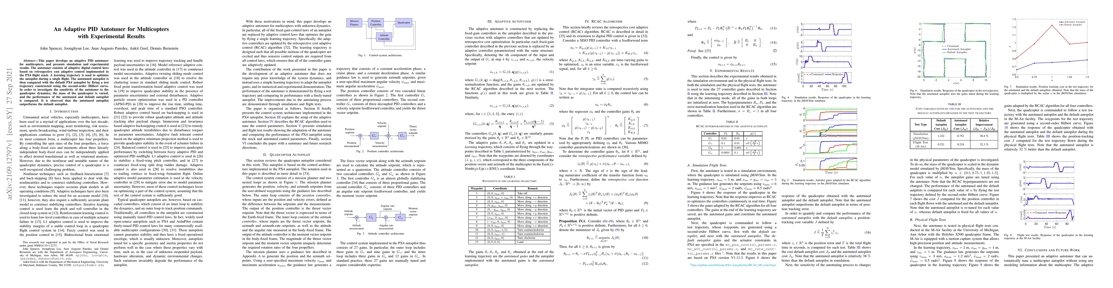 This paper develops an adaptive PID autotuner for multicopters, and presents simulation and experimental results. The autotuner consists of adaptive digital control laws based on retrospective cost adaptive control implemented in the PX4 flight stack. A learning trajectory is used to optimize the autopilot during a single flight. The autotuned autopilot is then compared with the default PX4 autopilot by flying a test trajectory constructed using the second-order Hilbert curve. In order to investigate the sensitivity of the autotuner to the quadcopter dynamics, the mass of the quadcopter is varied, and the performance of the autotuned and default autopilot is compared. It is observed that the autotuned autopilot outperforms the default autopilot.