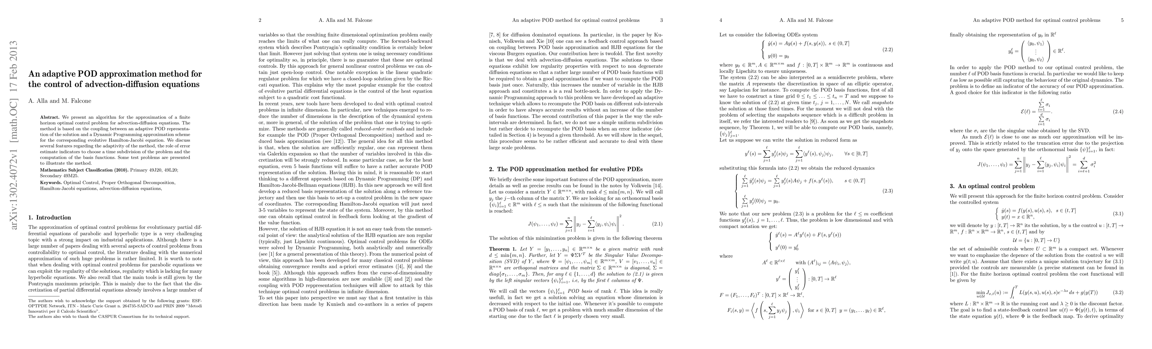 This paper proposes an adaptive Proper Orthogonal Decomposition (POD) method for solving optimal control problems in advection-diffusion equations, combining POD with Dynamic Programming for an evolutive Hamilton-Jacobi equation, and demonstrates its effectiveness through test problems.