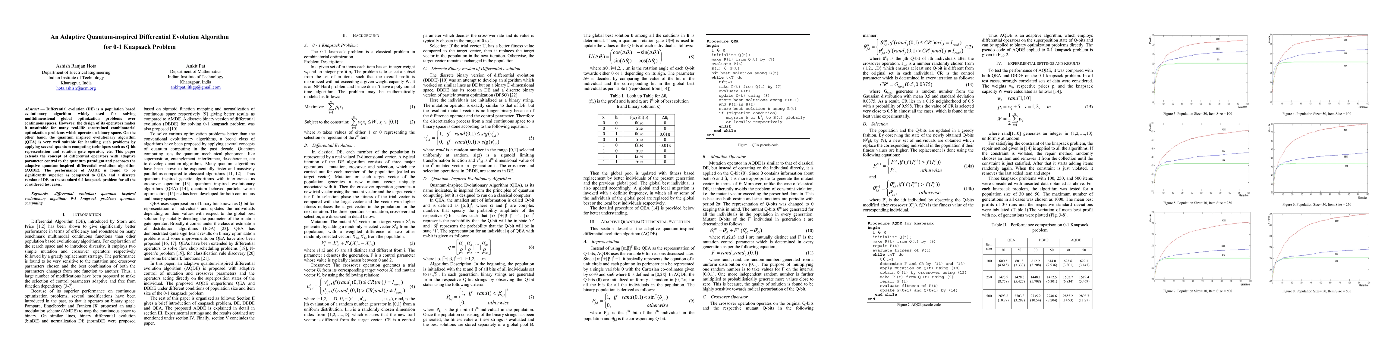 This paper proposes an adaptive quantum-inspired differential evolution algorithm (AQDE) for solving the 0-1 knapsack problem, combining differential evolution's adaptive parameters with quantum computing techniques. AQDE outperforms both quantum-inspired evolutionary algorithms and a discrete version of differential evolution on standard test cases.