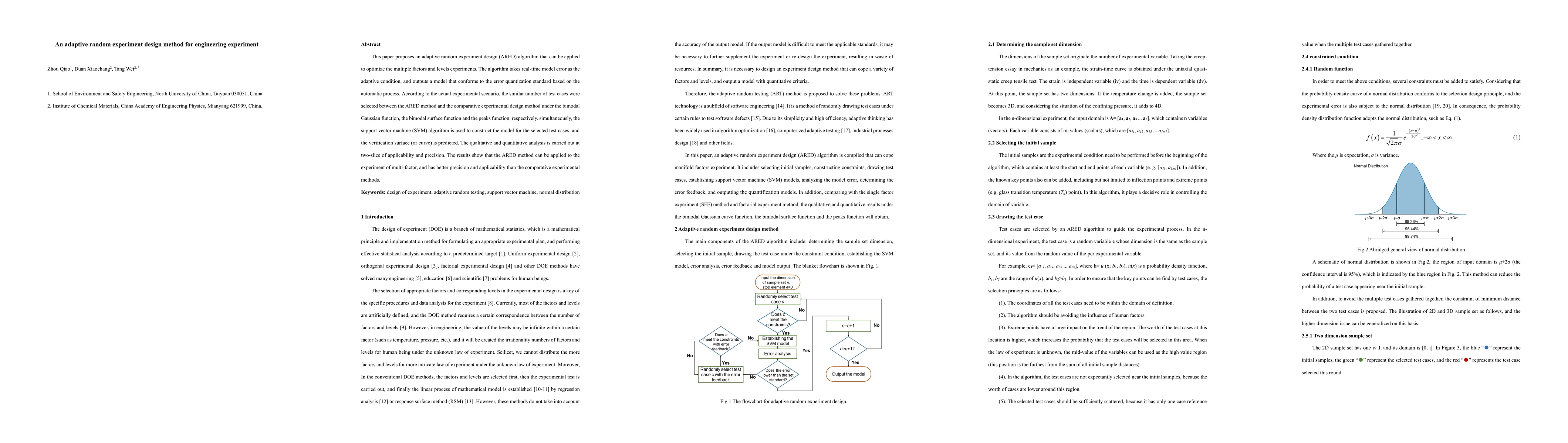 This paper introduces an adaptive random experiment design (ARED) algorithm to optimize multi-factor experiments, achieving better precision and applicability compared to traditional methods. The ARED method uses real-time model error as an adaptive condition and employs SVM for model construction and verification.