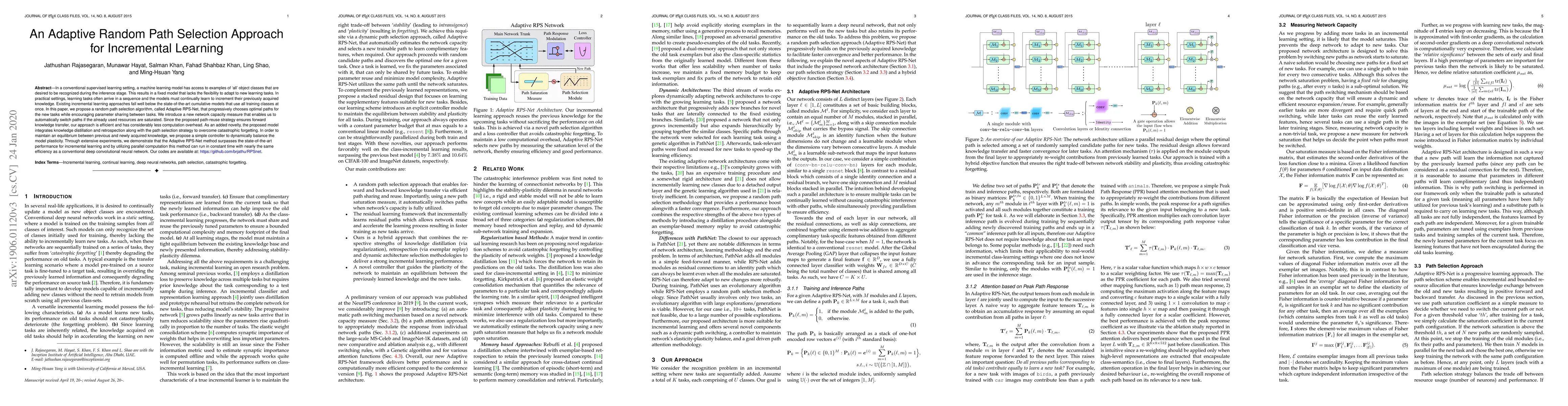 In a conventional supervised learning setting, a machine learning model has access to examples of all object classes that are desired to be recognized during the inference stage. This results in a fixed model that lacks the flexibility to adapt to new learning tasks. In practical settings, learning tasks often arrive in a sequence and the models must continually learn to increment their previously acquired knowledge. Existing incremental learning approaches fall well below the state-of-the-art cumulative models that use all training classes at once. In this paper, we propose a random path selection algorithm, called Adaptive RPS-Net, that progressively chooses optimal paths for the new tasks while encouraging parameter sharing between tasks. We introduce a new network capacity measure that enables us to automatically switch paths if the already used resources are saturated. Since the proposed path-reuse strategy ensures forward knowledge transfer, our approach is efficient and has considerably less computation overhead. As an added novelty, the proposed model integrates knowledge distillation and retrospection along with the path selection strategy to overcome catastrophic forgetting. In order to maintain an equilibrium between previous and newly acquired knowledge, we propose a simple controller to dynamically balance the model plasticity. Through extensive experiments, we demonstrate that the Adaptive RPS-Net method surpasses the state-of-the-art performance for incremental learning and by utilizing parallel computation this method can run in constant time with nearly the same efficiency as a conventional deep convolutional neural network.