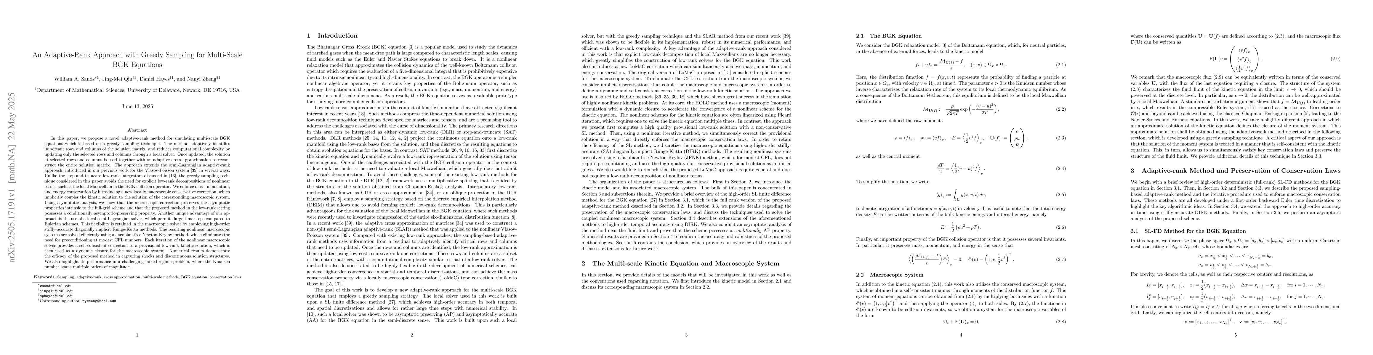The paper proposes an adaptive-rank method for multi-scale BGK equations using a greedy sampling strategy. It adaptively selects important matrix rows and columns, updates them with a local semi-Lagrangian solver, and reconstructs the full solution matrix via adaptive cross approximation.