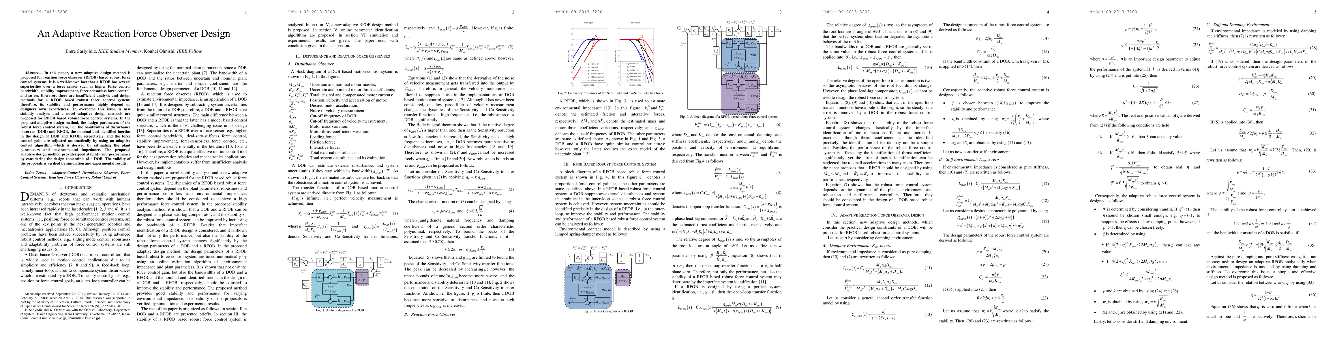 In this paper, a new adaptive design method is proposed for reaction force observer (RFOB) based robust force control systems. It is a well-known fact that an RFOB has several superiorities over a force sensor such as higher force control bandwidth, stability improvement, force-sensorless force control, and so on. However, there are insufficient analysis and design methods for an RFOB based robust force control system; therefore, its stability and performance highly depend on designers own experiences. To overcome this issue, new stability analysis and novel adaptive design methods are proposed for RFOB based robust force control systems. In the proposed adaptive design method, the design parameters of the robust force control system, i.e., the bandwidths of a disturbance observer (DOB) and an RFOB, the nominal and identified inertias in the design of a DOB and an RFOB, respectively, and the force control gain, are adjusted automatically by using an adaptive control algorithm which is derived by estimating the plant parameters and environmental impedance. The proposed adaptive design method provides good stability and performance by considering the design constraints of a DOB. The validity of the proposals is verified by simulation and experimental results.