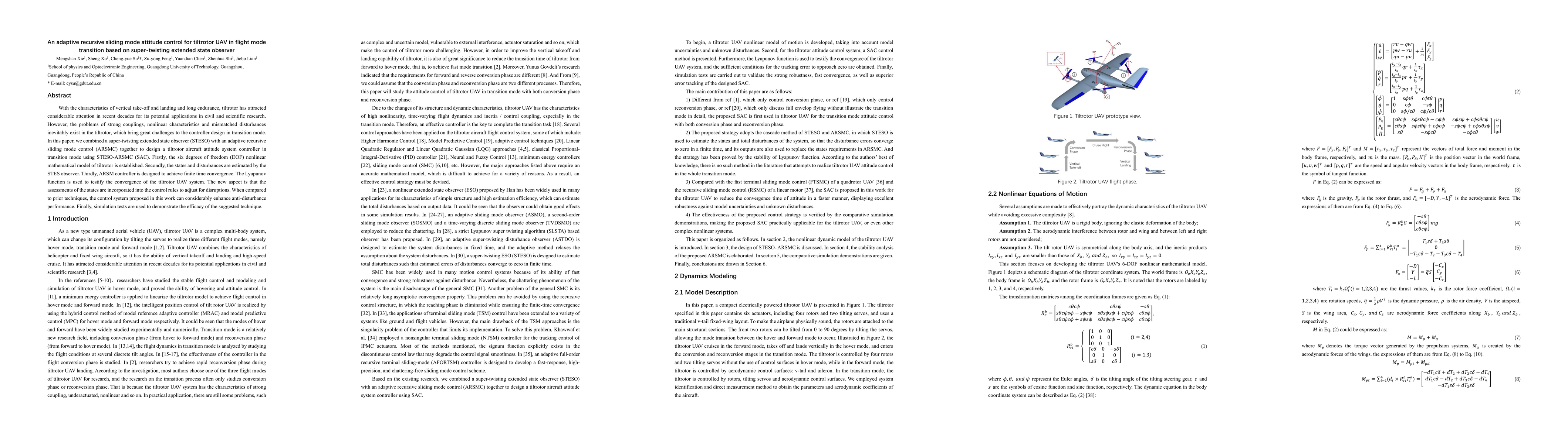 With the characteristics of vertical take-off and landing and long endurance, tiltrotor has attracted considerable attention in recent decades for its potential applications in civil and scientific research. However, the problems of strong couplings, nonlinear characteristics and mismatched disturbances inevitably exist in the tiltrotor, which bring great challenges to the controller design in transition mode. In this paper, we combined a super-twisting extended state observer (STESO) with an adaptive recursive sliding mode control (ARSMC) together to design a tiltrotor aircraft attitude system controller in transition mode using STESO-ARSMC (SAC). Firstly, the six degrees of freedom (DOF) nonlinear mathematical model of tiltrotor is established. Secondly, the states and disturbances are estimated by the STES observer. Thirdly, ARSM controller is designed to achieve finite time convergence. The Lyapunov function is used to testify the convergence of the tiltrotor UAV system. The new aspect is that the assessments of the states are incorporated into the control rules to adjust for disruptions. When compared to prior techniques, the control system proposed in this work can considerably enhance anti-disturbance performance. Finally, simulation tests are used to demonstrate the efficacy of the suggested technique.