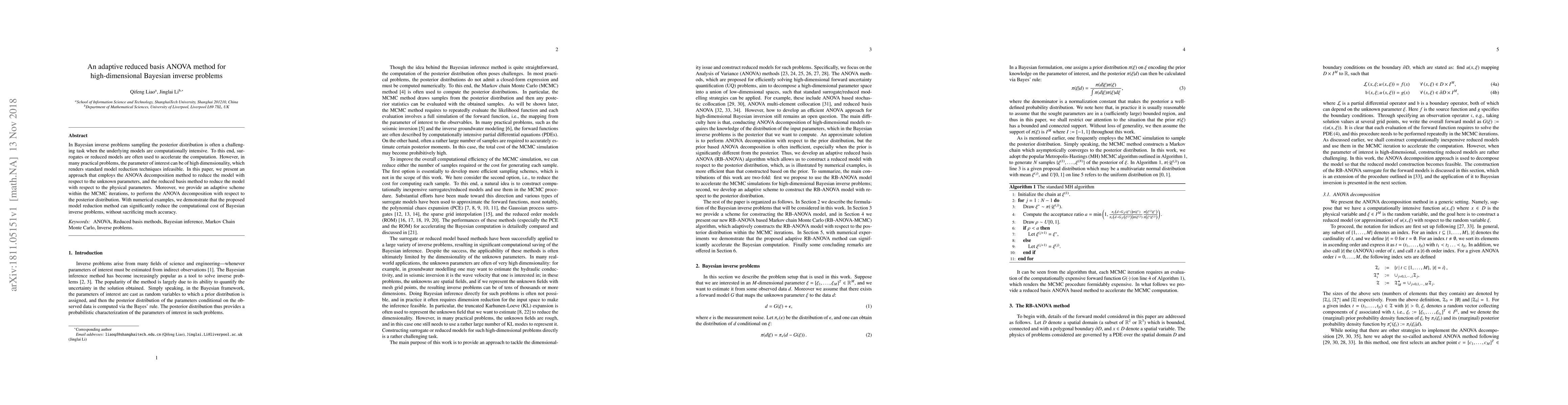 This paper introduces an adaptive reduced basis ANOVA method to efficiently solve high-dimensional Bayesian inverse problems. The approach combines ANOVA decomposition and reduced basis techniques to manage computational intensity, with an adaptive scheme that updates the model reduction during MCMC iterations, demonstrating significant computational savings with minimal loss in accuracy.