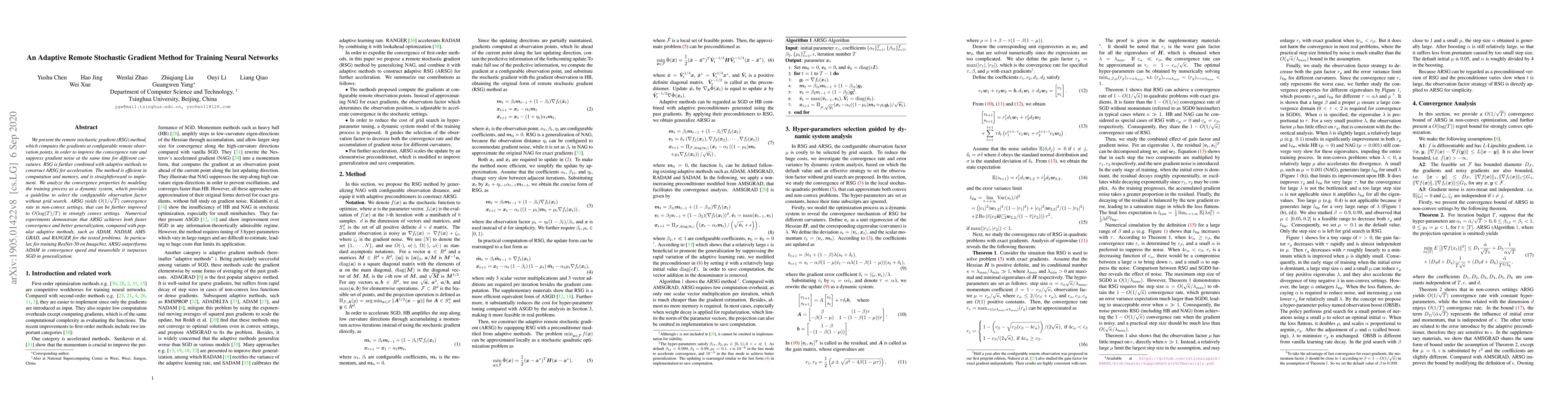 We present the remote stochastic gradient (RSG) method, which computes the gradients at configurable remote observation points, in order to improve the convergence rate and suppress gradient noise at the same time for different curvatures. RSG is further combined with adaptive methods to construct ARSG for acceleration. The method is efficient in computation and memory, and is straightforward to implement. We analyze the convergence properties by modeling the training process as a dynamic system, which provides a guideline to select the configurable observation factor without grid search. ARSG yields $O(1/\sqrt{T})$ convergence rate in non-convex settings, that can be further improved to $O(\log(T)/T)$ in strongly convex settings. Numerical experiments demonstrate that ARSG achieves both faster convergence and better generalization, compared with popular adaptive methods, such as ADAM, NADAM, AMSGRAD, and RANGER for the tested problems. In particular, for training ResNet-50 on ImageNet, ARSG outperforms ADAM in convergence speed and meanwhile it surpasses SGD in generalization.