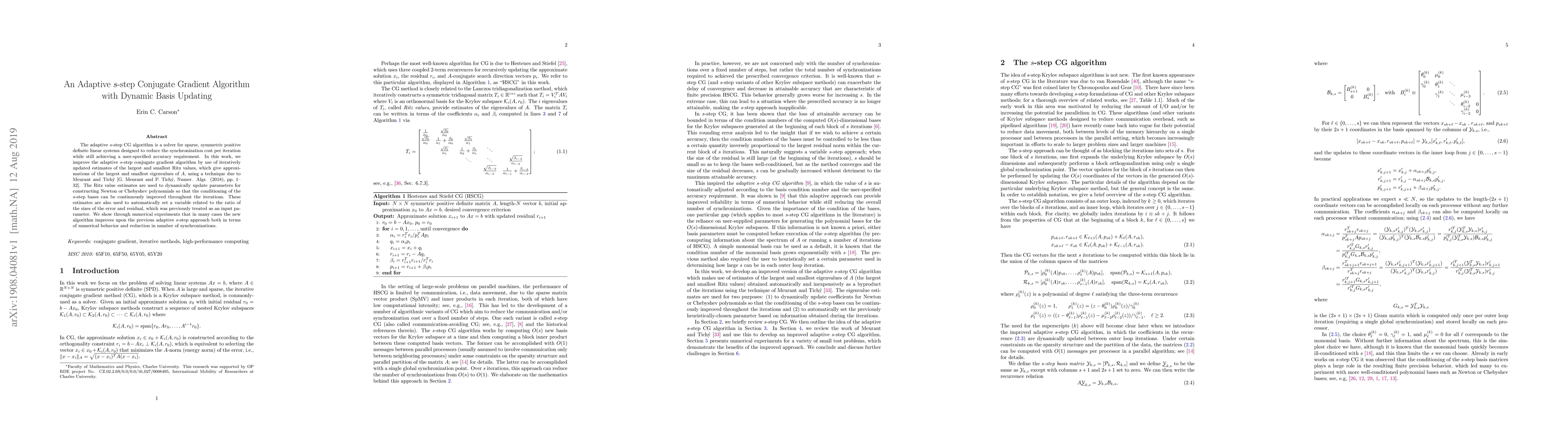 The adaptive $s$-step conjugate gradient algorithm is improved with dynamic basis updating using Ritz value estimates to enhance accuracy and reduce synchronization cost in sparse, symmetric positive definite linear systems.
