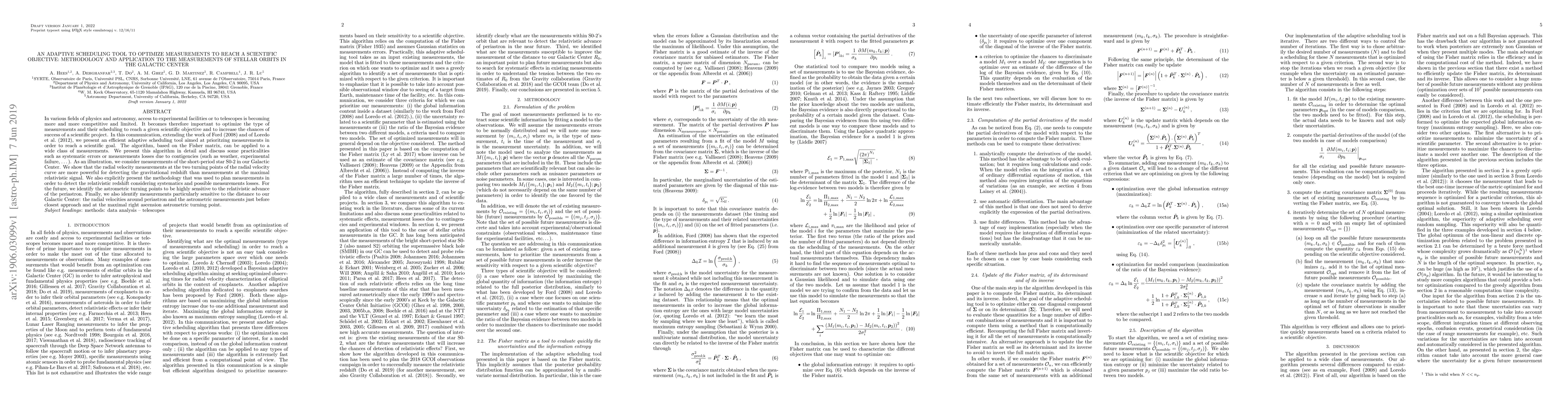 In various fields of physics and astronomy, access to experimental facilities or to telescopes is becoming more and more competitive and limited. It becomes therefore important to optimize the type of measurements and their scheduling to reach a given scientific objective and to increase the chances of success of a scientific project. In this communication, extending the work of Ford (2008) and of Loredo et al. (2012), we present an efficient adaptive scheduling tool aimed at prioritzing measurements in order to reach a scientific goal. The algorithm, based on the Fisher matrix, can be applied to a wide class of measurements. We present this algorithm in detail and discuss some practicalities such as systematic errors or measurements losses due to contigencies (such as weather, experimental failure, ...). As an illustration, we consider measurements of the short-period star S0-2 in our Galactic Center. We show that the radial velocity measurements at the two turning points of the radial velocity curve are more powerful for detecting the gravitational redshift than measurements at the maximal relativistic signal. We also explicitly present the methodology that was used to plan measurements in order to detect the relativistic redshift considering systematics and possible measurements losses. For the future, we identify the astrometric turning points to be highly sensitive to the relativistic advance of the periastron. Finally, we also identify measurements particularly sensitive to the distance to our Galactic Center: the radial velocities around periastron and the astrometric measurements just before closest approach and at the maximal right ascension astrometric turning point.