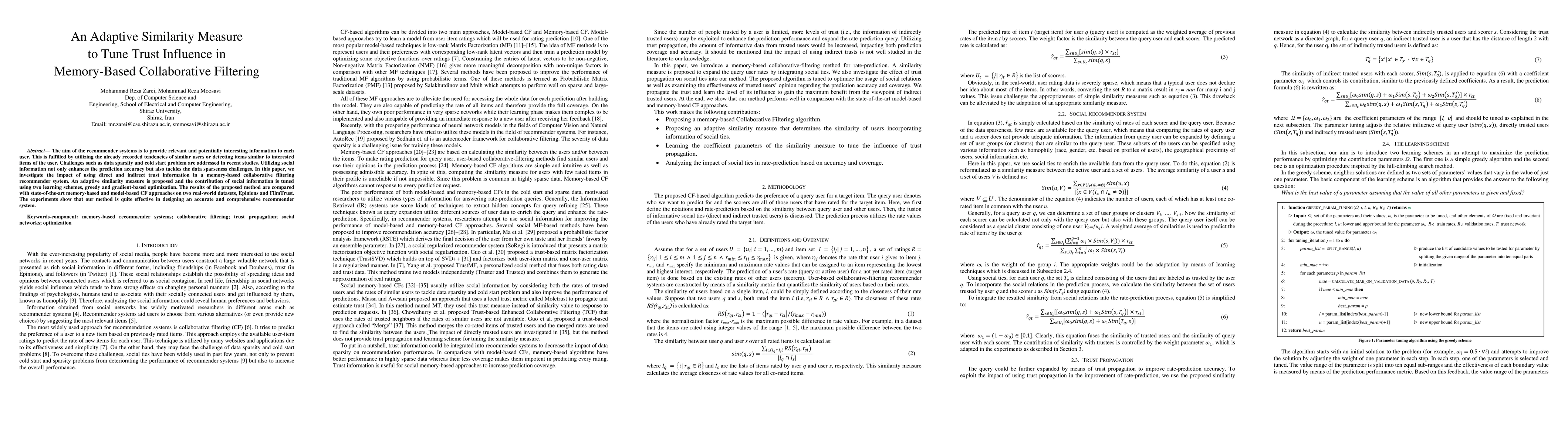 The aim of the recommender systems is to provide relevant and potentially interesting information to each user. This is fulfilled by utilizing the already recorded tendencies of similar users or detecting items similar to interested items of the user. Challenges such as data sparsity and cold start problem are addressed in recent studies. Utilizing social information not only enhances the prediction accuracy but also tackles the data sparseness challenges. In this paper, we investigate the impact of using direct and indirect trust information in a memory-based collaborative filtering recommender system. An adaptive similarity measure is proposed and the contribution of social information is tuned using two learning schemes, greedy and gradient-based optimization. The results of the proposed method are compared with state-of-the-art memory-based and model-based CF approaches on two real-world datasets, Epinions and FilmTrust. The experiments show that our method is quite effective in designing an accurate and comprehensive recommender system.