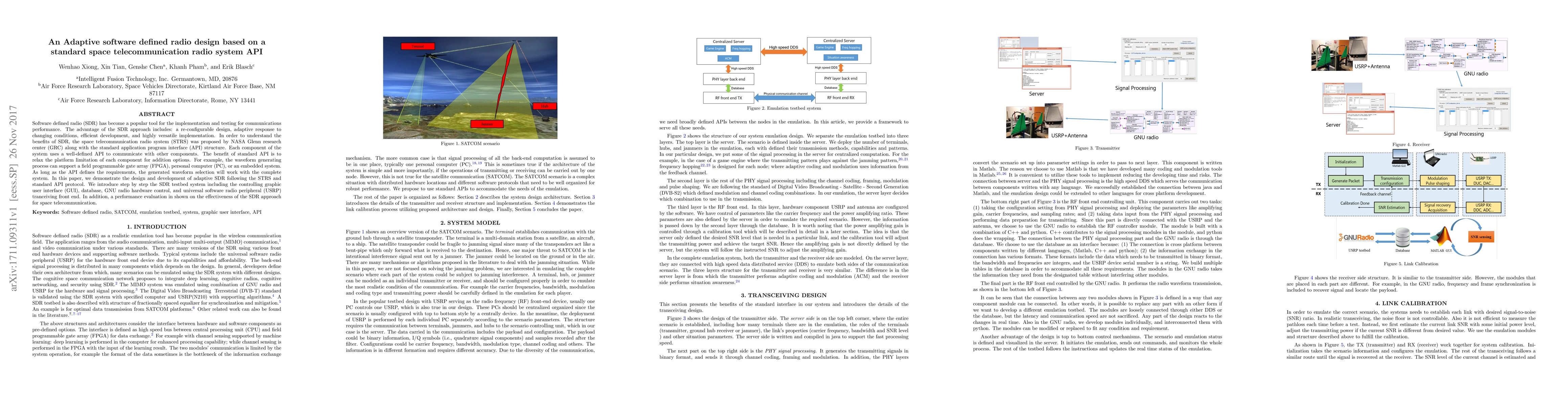 Software defined radio (SDR) has become a popular tool for the implementation and testing for communications performance. The advantage of the SDR approach includes: a re-configurable design, adaptive response to changing conditions, efficient development, and highly versatile implementation. In order to understand the benefits of SDR, the space telecommunication radio system (STRS) was proposed by NASA Glenn research center (GRC) along with the standard application program interface (API) structure. Each component of the system uses a well-defined API to communicate with other components. The benefit of standard API is to relax the platform limitation of each component for addition options. For example, the waveform generating process can support a field programmable gate array (FPGA), personal computer (PC), or an embedded system. As long as the API defines the requirements, the generated waveform selection will work with the complete system. In this paper, we demonstrate the design and development of adaptive SDR following the STRS and standard API protocol. We introduce step by step the SDR testbed system including the controlling graphic user interface (GUI), database, GNU radio hardware control, and universal software radio peripheral (USRP) tranceiving front end. In addition, a performance evaluation in shown on the effectiveness of the SDR approach for space telecommunication.