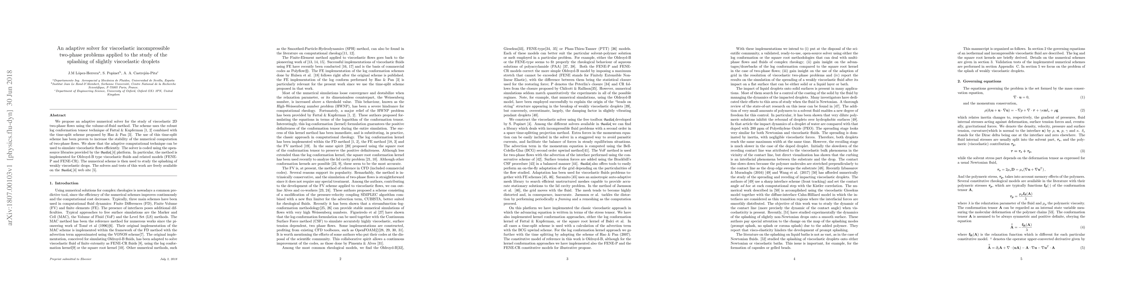 We propose an adaptive numerical solver for the study of viscoelastic 2D two-phase flows using the volume-of-fluid method. The scheme uses the robust log conformation tensor technique of Fattal & Kupferman (2004,2005} combined with the time-split scheme proposed by Hao & Pan (2007}. The use of this time-split scheme has been proven to increase the stability of the numerical computation of two-phase flows. We show that the adaptive computational technique can be used to simulate viscoelastic flows efficiently. The solver is coded using the open-source libraries provided by the \basilisk \cite{Basilisk} platform. In particular, the method is implemented for Oldroyd-B type viscoelastic fluids and related models (FENE-P and FENE-CR). The numerical scheme is then used to study the splashing of weakly viscoelastic drops. The solvers and tests of this work are freely available on the Basilisk web site
